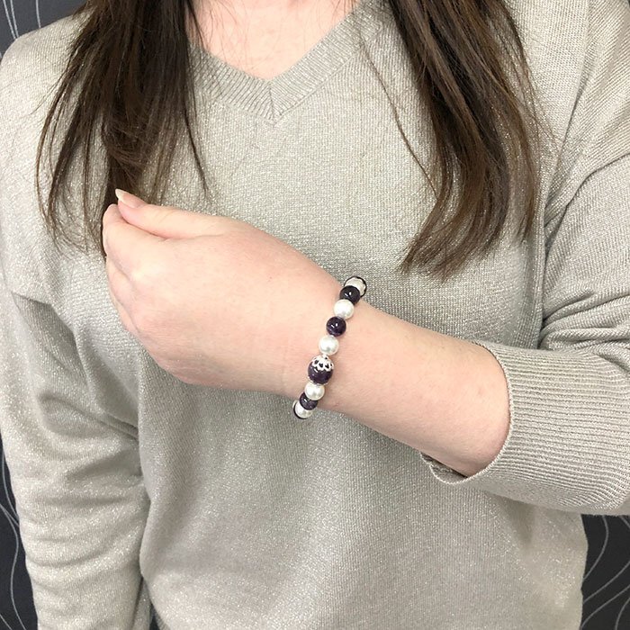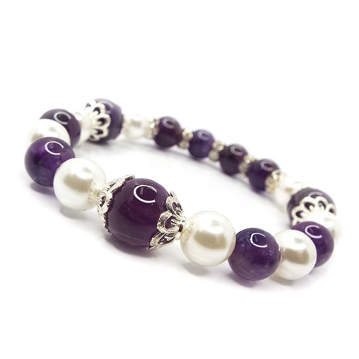 【STONE KITCHEN 天然石 パワーストーン】 ☆新作!シェルパール ラグジュアリーブレスレット☆ 貝という生命体が生み出した、生き生きとした活力のある エネルギーをもつとされ ストレスで疲れた心身を癒してくれるでしょう。 母貝に守られ、成長してきたため、守護のパワーが強いとされます。 喜びや悲しみに対して、敏感に応じるヒーリング効果があるとされ、 人間的な成長を促してくれるでしょう。 愛情運や家族運にいいと言われるパワーストーンとの 組み合わせでさらに効果が得られそう♪ 内周:約16cm サイズ:アメジスト 10mm・8mm シェルパール 8mm 1点 注意事項 ※金属部分は汗や汚れ等で変色する場合がございます。気になる場合は金属磨きや布等で軽くふき取る事をおすすめします。 ※石の種類によっては、艶を引き出すことを目的として、ワックスや着色加工がされているものもあります。 ※表示のサイズは必ずしも最大値・最小値のサイズのものが入っているわけではございません。 ※天然石のため同じものでも色味・模様などが異なります。 ※照明の具合で実際とは色合いが異なる場合がございます。 また、天然素材特有のクラック・内包物を有する場合がございます。予めご了承下さい。 | |