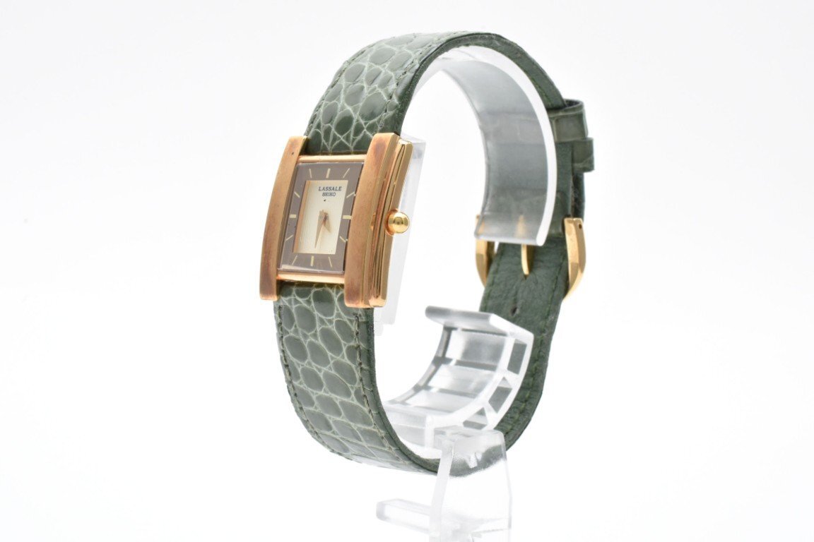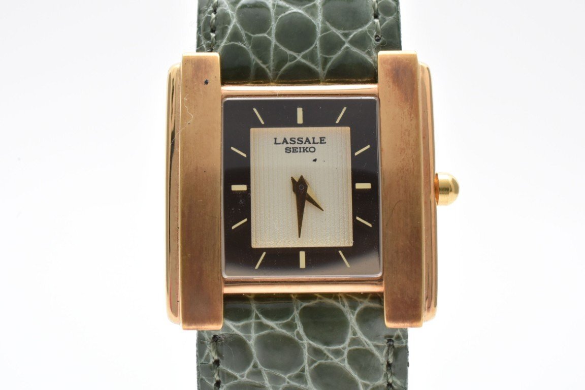 SEIKO セイコー LASSALE 腕時計 メンズ クォーツ式 ゴールド シルバー文字盤 2針 アンティーク 緑ベルト 1F20-5220