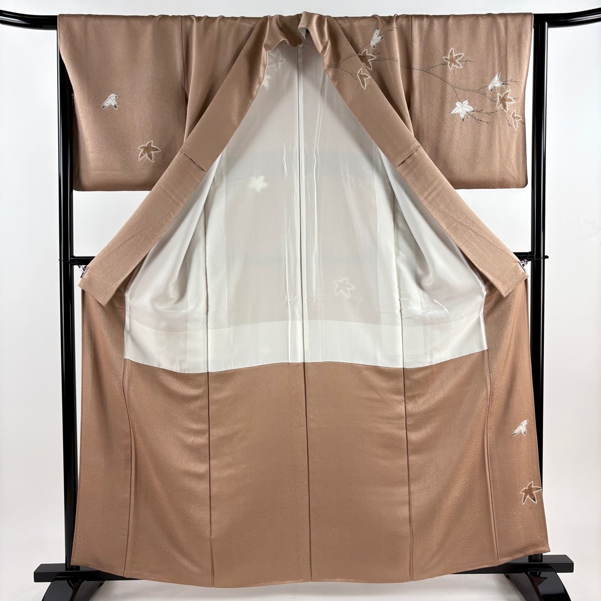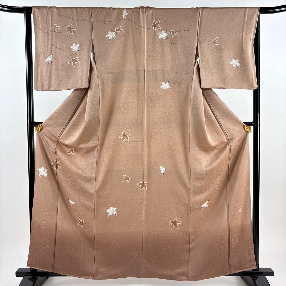 付下げ 美品 名品 落款 楓 地紋 絞り ぼかし 薄茶色 袷 身丈162 裄丈65 M 正絹 【中古】 |