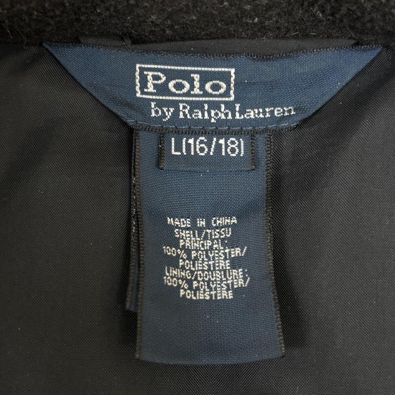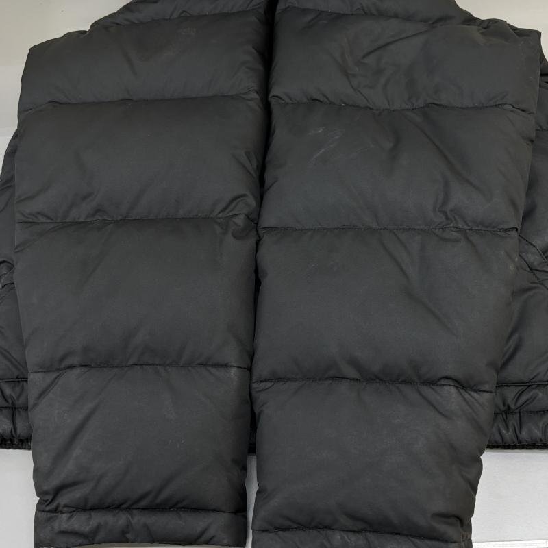 サイズ表記は「L(16/18)」です。全体に擦れによる白っぽいアタリ汚れや光沢あり。袖口に汚れ。金具周りに赤い色移り。右袖に小さいダメージ。内襟に毛羽立ちや毛玉あり。