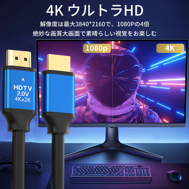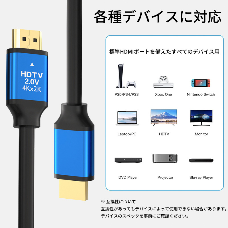 HDMI Ver2.0b(ハイスピード)、ノイズに強い高品質の線材を採用(柔らかいPVC被覆)、