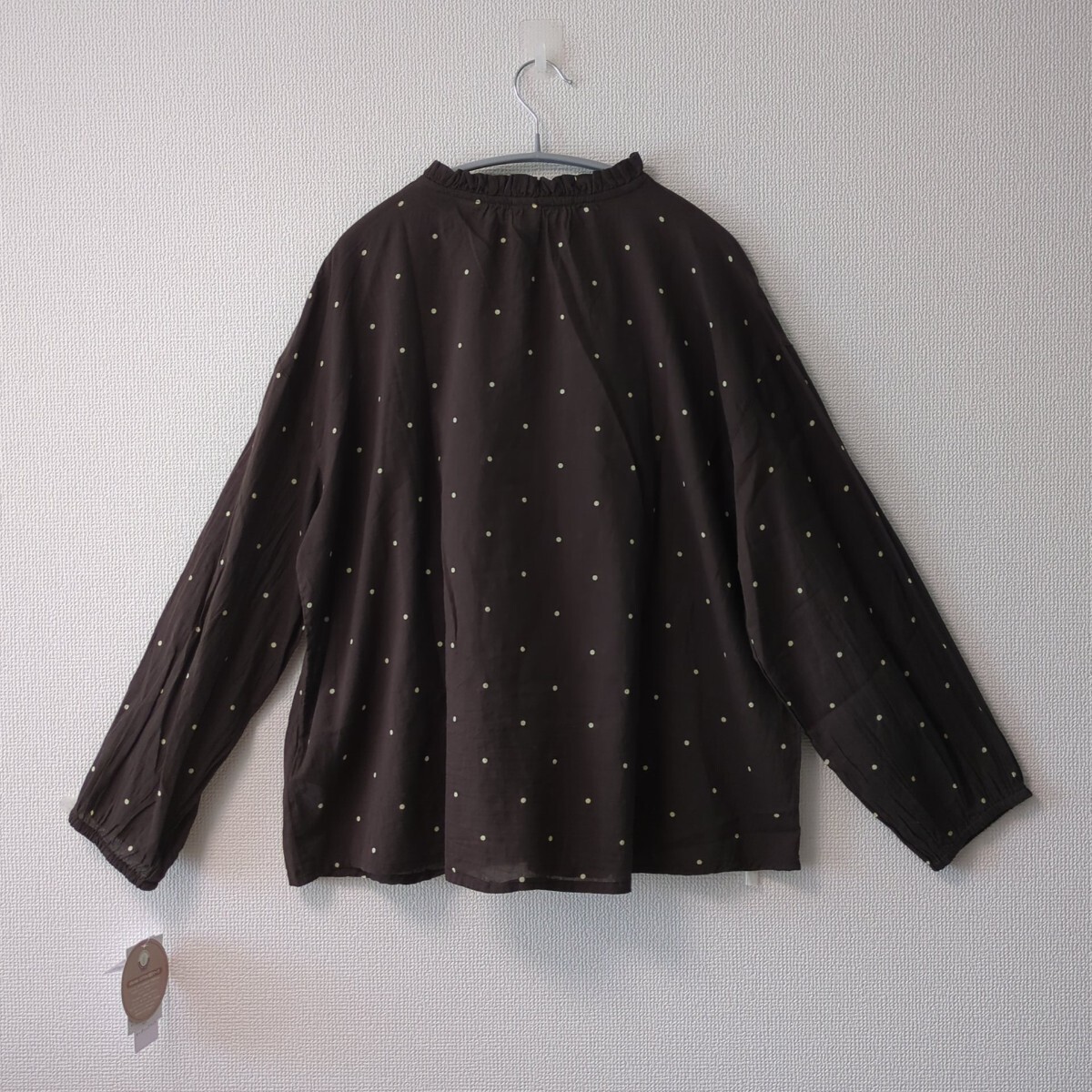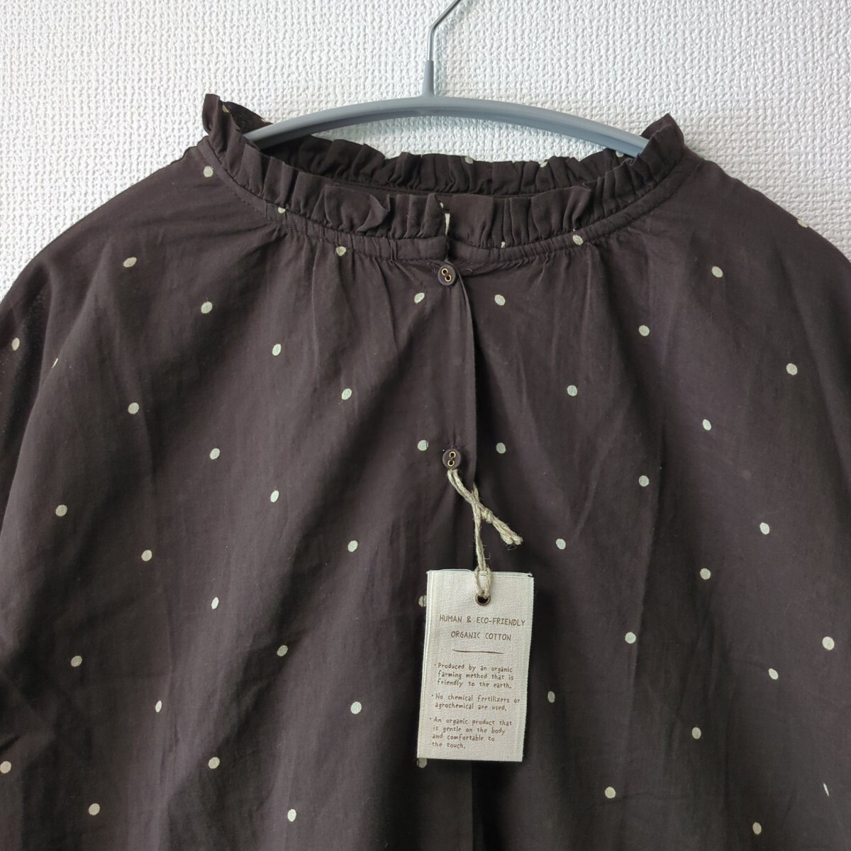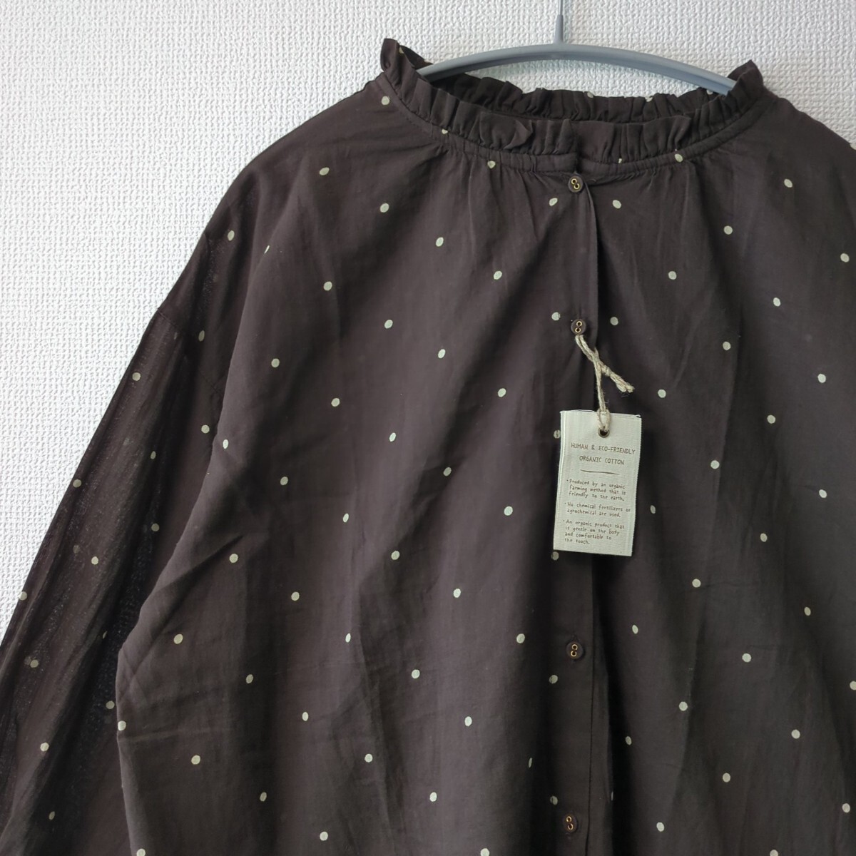 新品 オーガニックコットン 襟フリルドット前開き長袖ブラウス 水玉 ナチュラル カジュアル