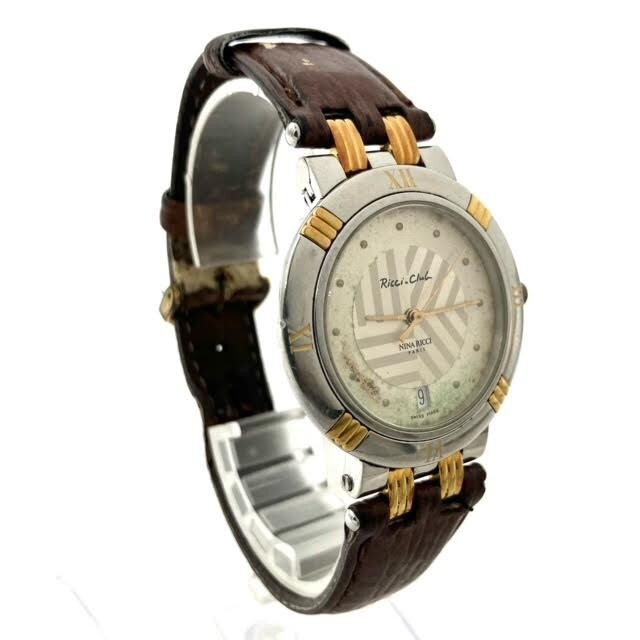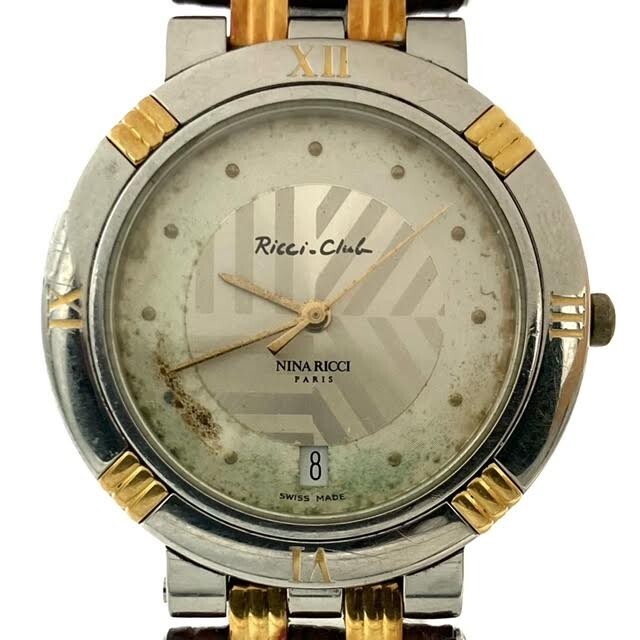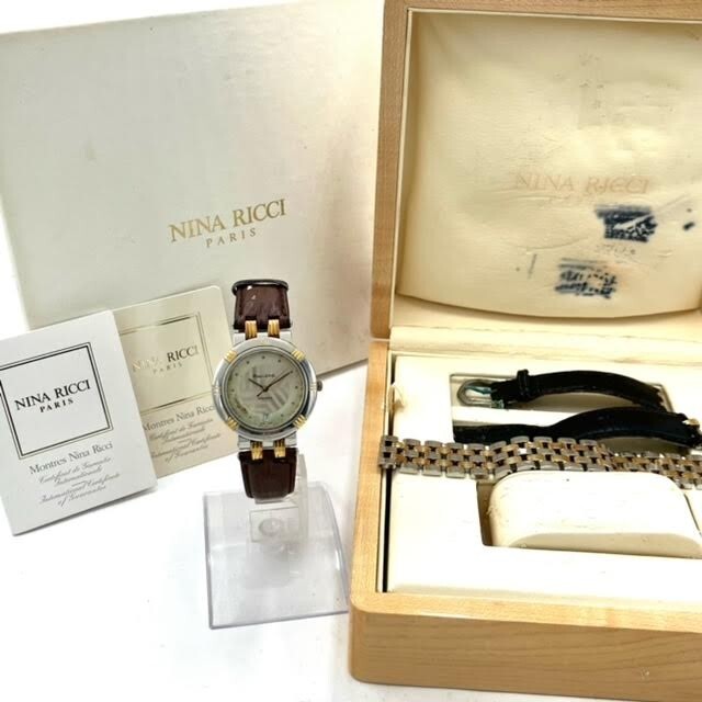 仙85 NINA RICCI 腕時計 クォーツ デイト アナログ 3針 外箱 ケース 替えベルト ニナリッチ QZ レディース シルバー文字盤 ラウンド