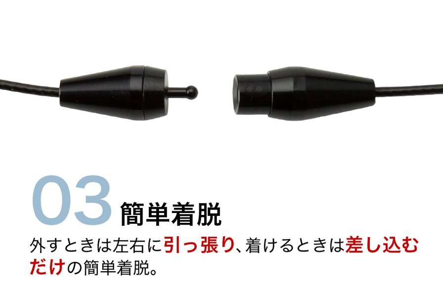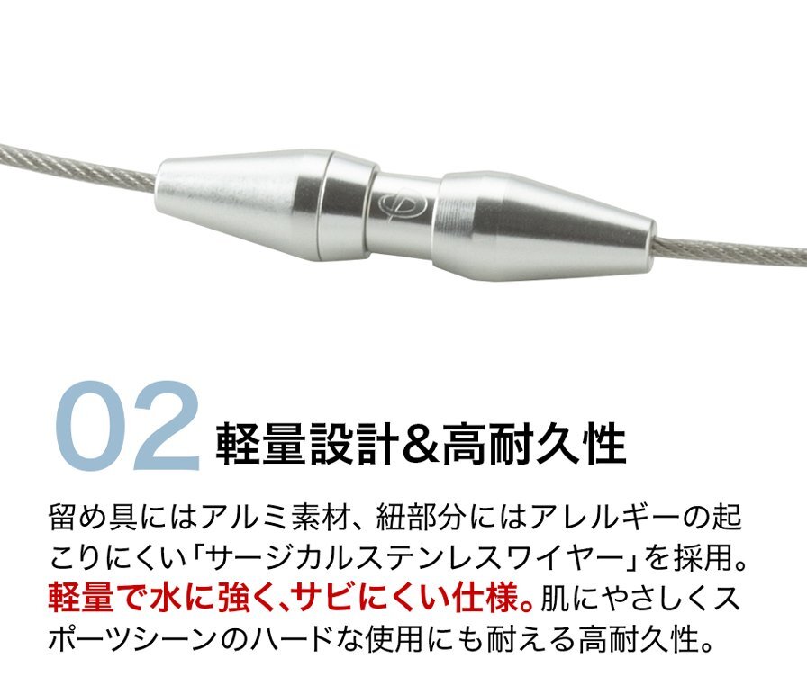 留め具にはアルミ素材、紐部分にはアレルギーの起こりにくい「サージカルステンレスワイヤー」を採用。