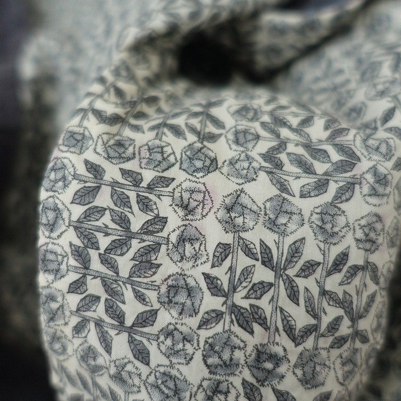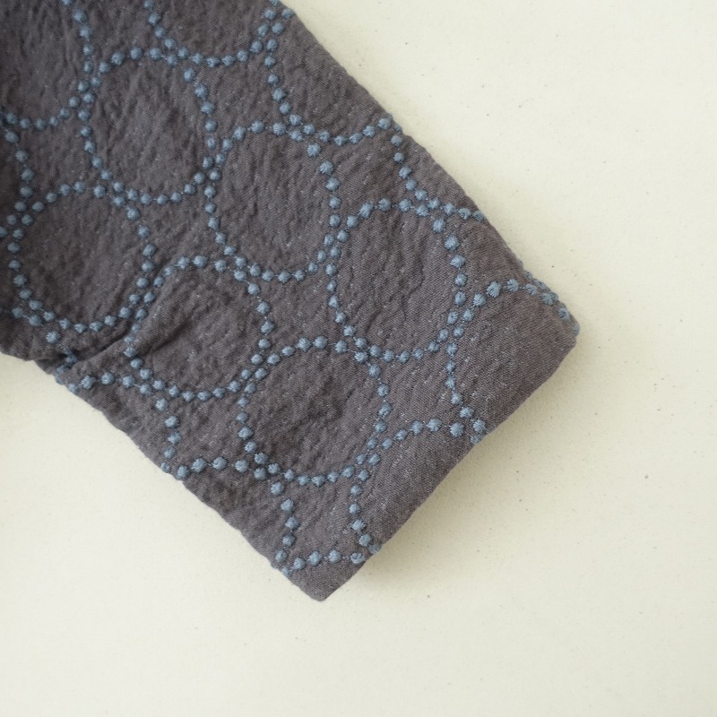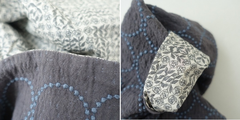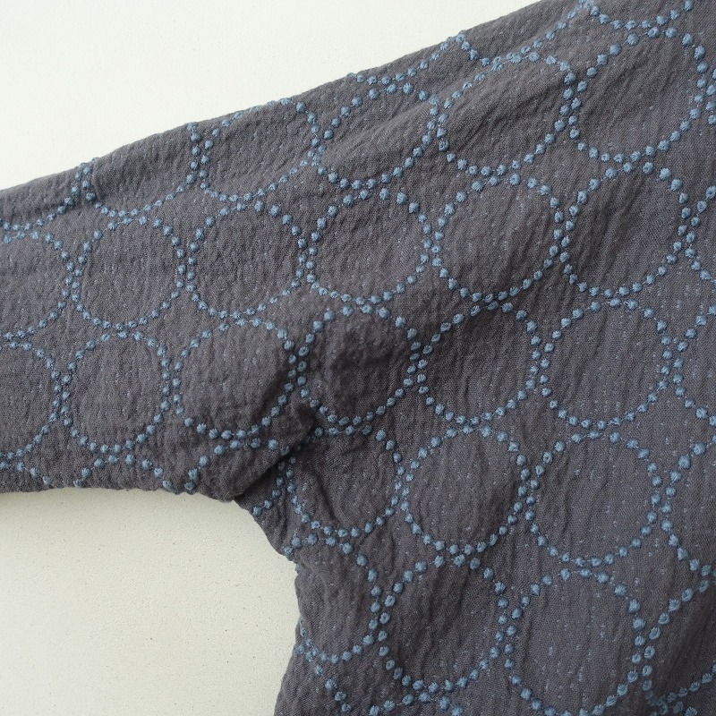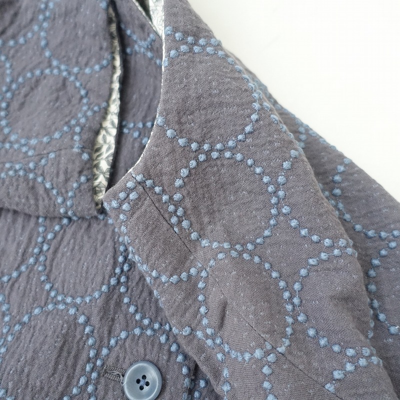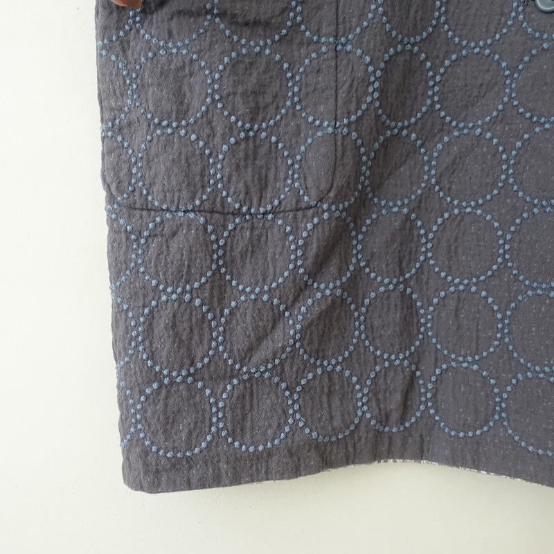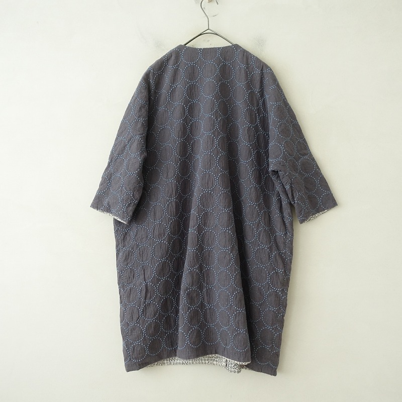 mina perhonenのtambourine 刺しゅうノーカラーリバーシブルコートです。カラーはグレーベースに、グレーブルーのtambourineのテキスタイルがあしらわれ、内側はグレー系Sleeping Roseのテキスタイル地のリバーシブルデザインです。ボタン開閉で、表裏共に両サイドにポケット付きです。 |