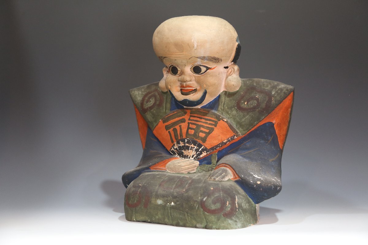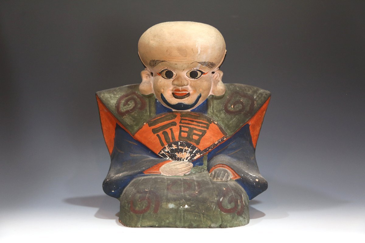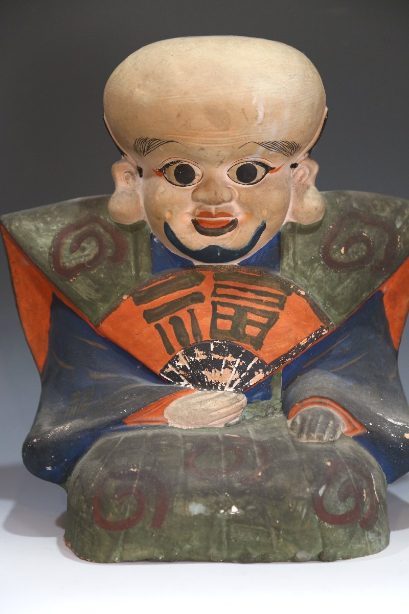 大きなおでこの古い福助です。江戸期の福助でヒゲも生えています。このような大きな福助は滅多にお目にかかりません。おでこもかなり出ています。経年の剥がれあります。横38cm、縦42cm。ノークレーム、ノーリターンでお願い致します。この他にも出品しておりますので、ご覧下さい。ここをクリック