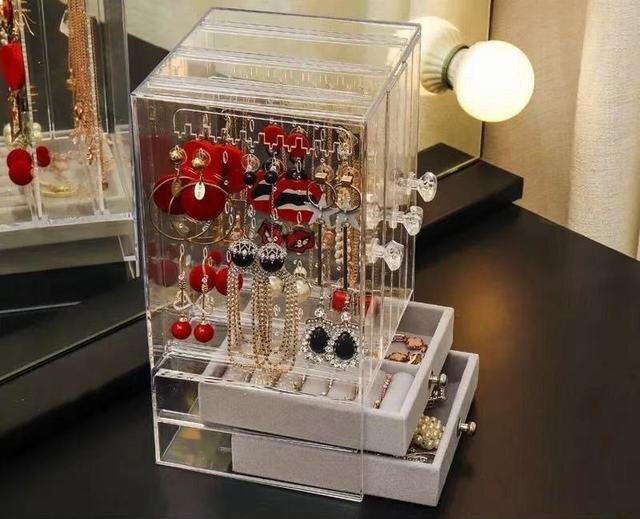 商品説明:シンプルなデザインでたくさんのアクセサリーをすっきり収納できます。 縦引き出しにはピアス最大240個分収納可能な驚きの収納力がございます。横引き出しには指輪類やブレスレット類なども収納可能です。ベロア素材でアクセサリーに傷が付きにくいです。 スライド式で取り出せるので大切なアクセサリー類をほこりからも防いでくれます。