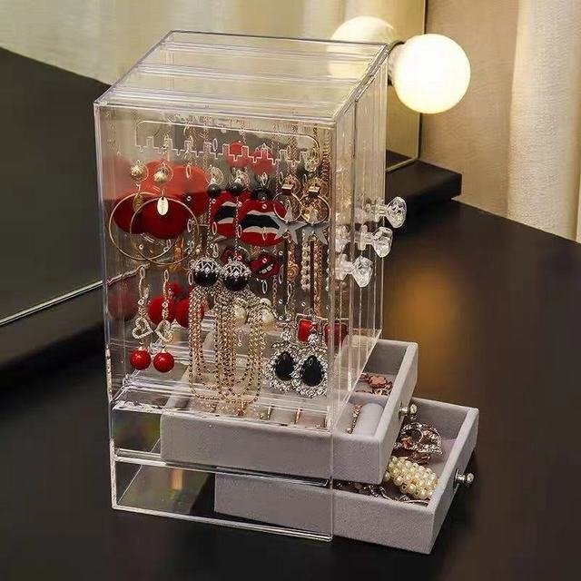 サイズ:約幅13cm×奥行13cm×高さ25cm 素材:アクリル ベロア 5分け:縦引き出し(凹凸フック×10ホール×72)×3 横引き出し:リング収納&仕切りあり×1 仕切りなし×1
