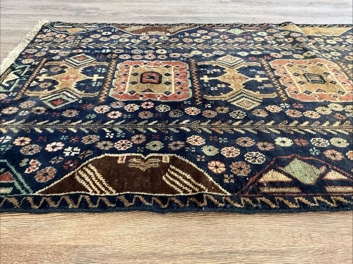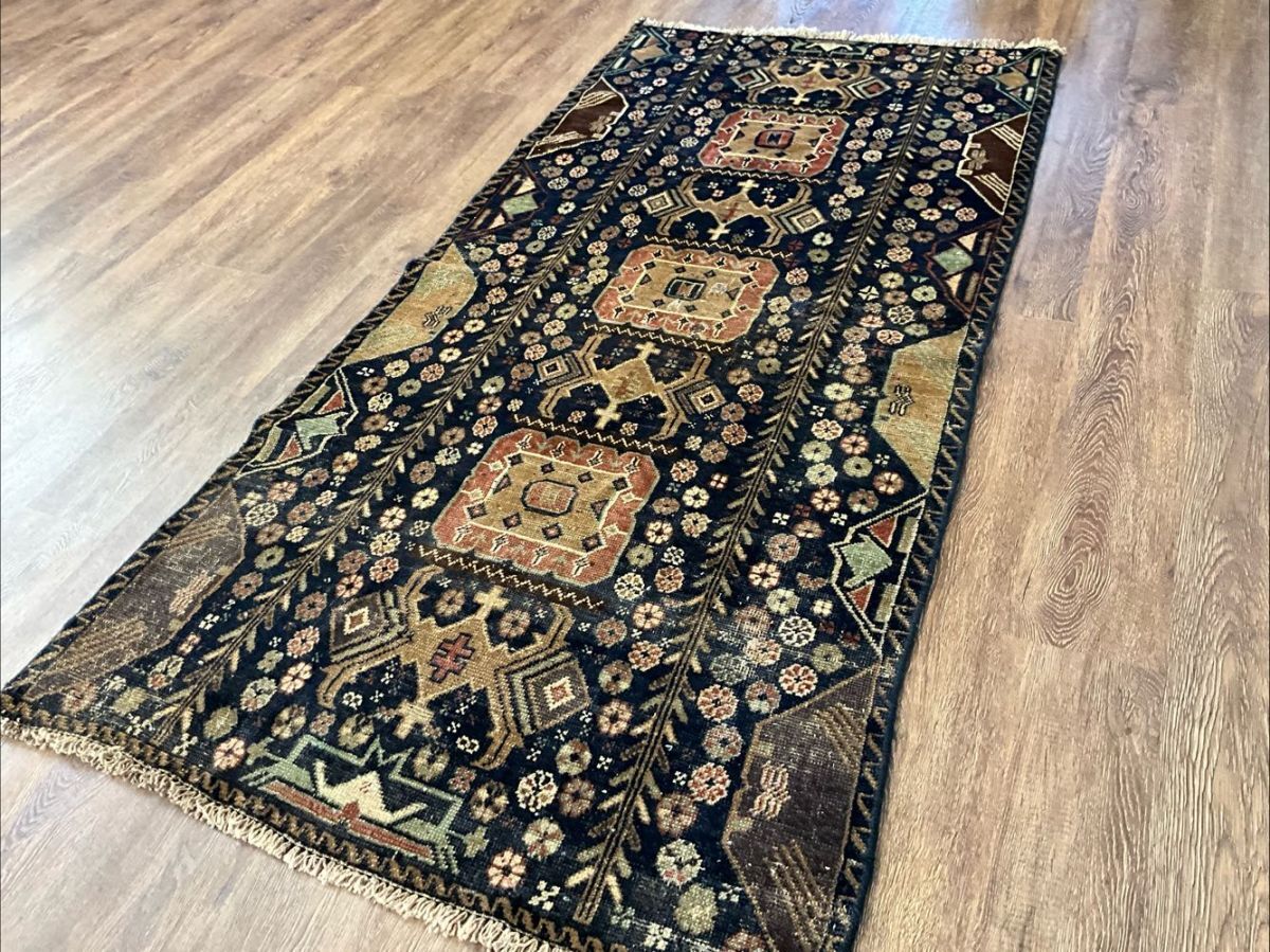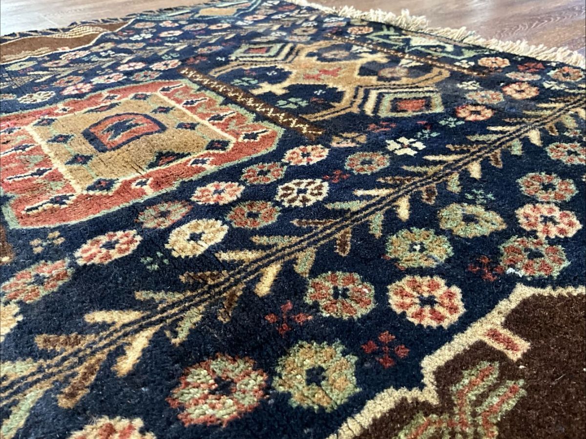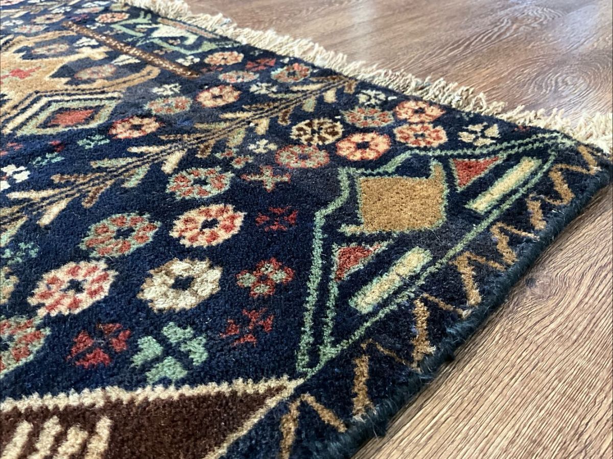 ★ヴィンテージネイビー★年々希少価値の高まっているヴィンテージのネイビーバルーチ。中央などにリペア痕が数カ所、下部に経年による擦れが広がっております。手織りの味わいを感じるしなやかで丈夫な織り、経年により低くなったパイルはさっぱりとした質感、ミッドナイトネイビーのフィールドに敷き詰められた愛らしい花や植物のモチーフ、補修され長く生活に寄り添ってきた事が見てとれる素晴らしいヴィンテージ絨毯です。(画像をご確認下さい。)