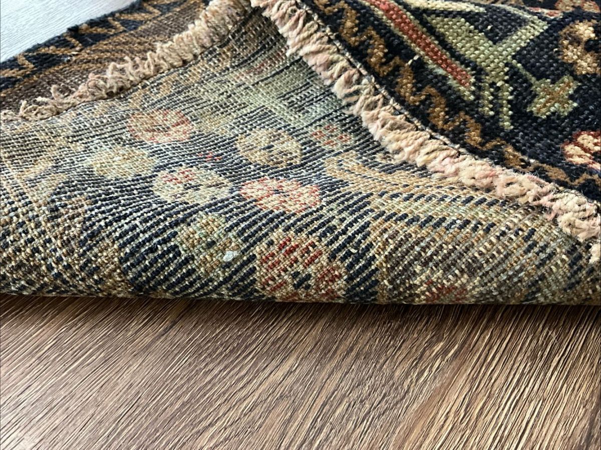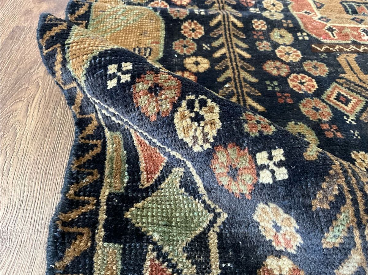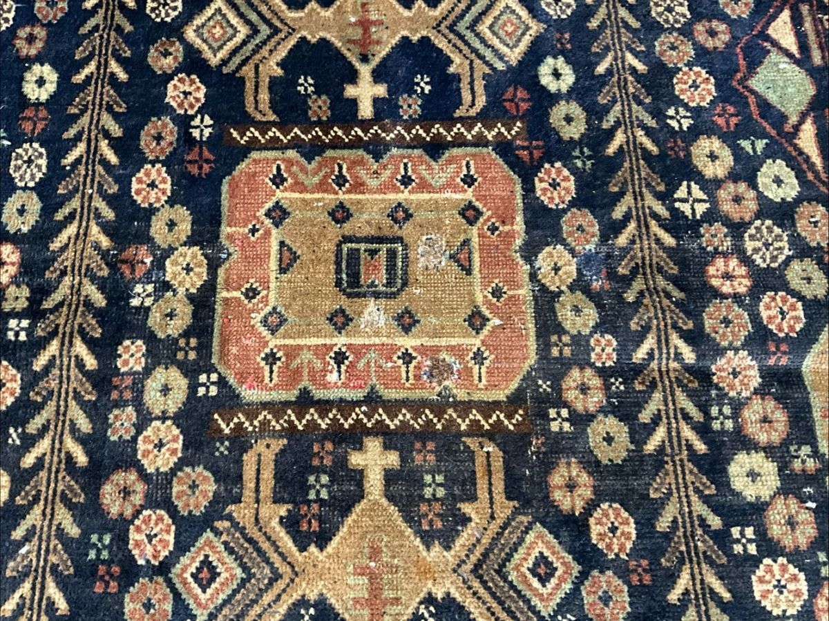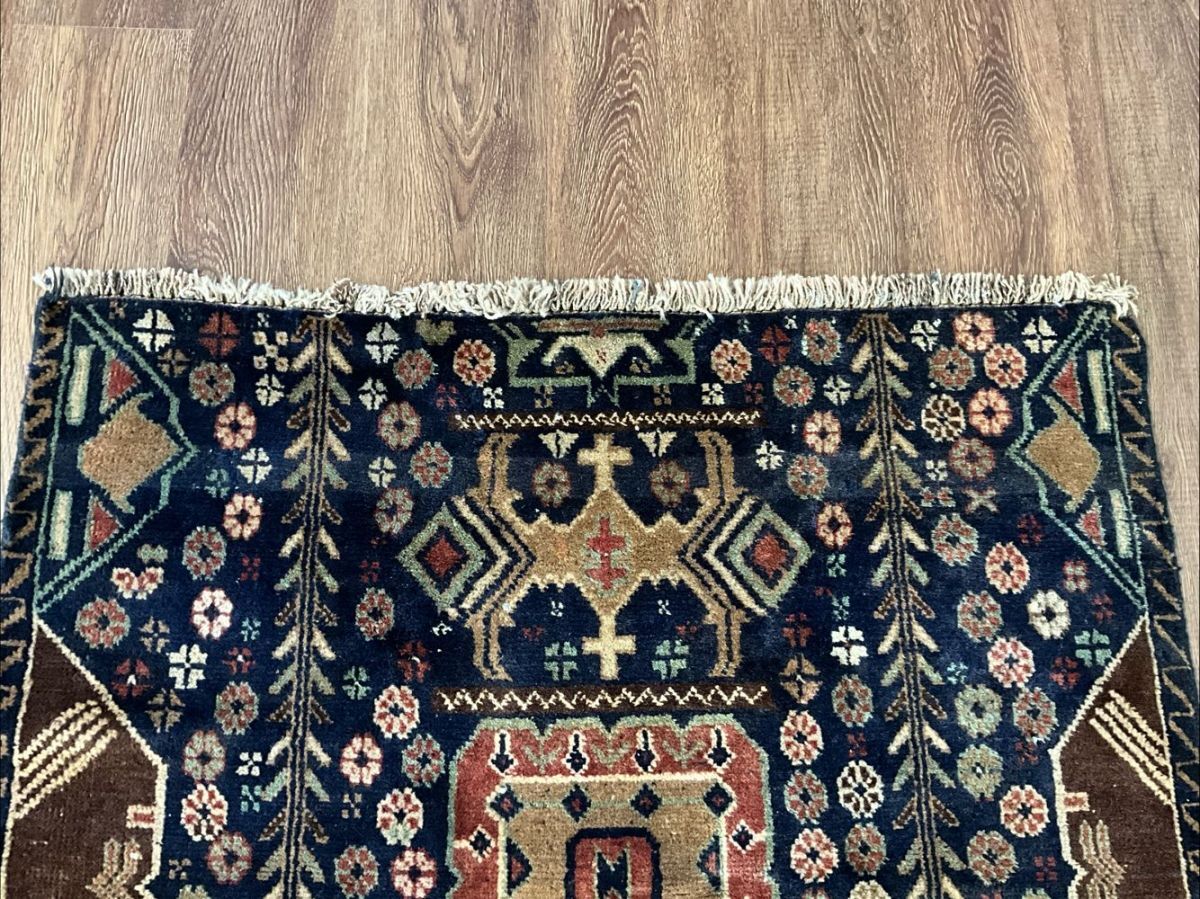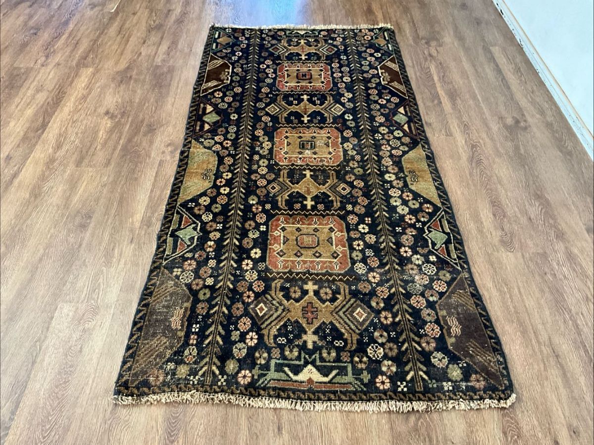 ★ヴィンテージネイビー★年々希少価値の高まっているヴィンテージのネイビーバルーチ。中央などにリペア痕が数カ所、下部に経年による擦れが広がっております。手織りの味わいを感じるしなやかで丈夫な織り、経年により低くなったパイルはさっぱりとした質感、ミッドナイトネイビーのフィールドに敷き詰められた愛らしい花や植物のモチーフ、補修され長く生活に寄り添ってきた事が見てとれる素晴らしいヴィンテージ絨毯です。(画像をご確認下さい。)