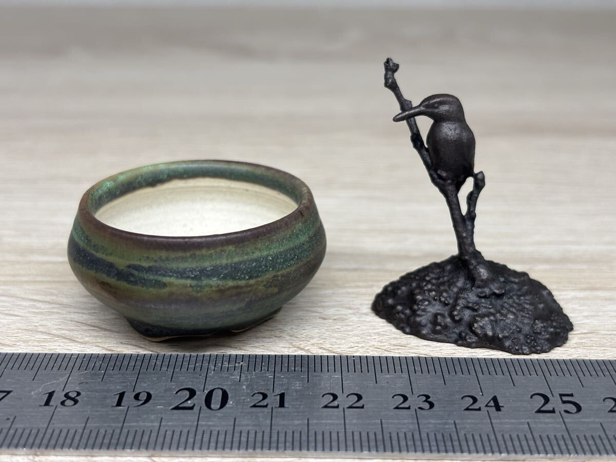 ◆商品/一蒼さんの鉢1個とカワセミの添配1個のセットです。添配は市販のフィギュアを使用した自作品です。カワセミ部分は金属で重く、止まり木と台座は木製で軽いため、バランスはかなり悪いです。そっと置けば自立しますが、頭でっかちな感じで、乱暴に置くと、すぐにコテンと倒れてしまいます。塗料は何度も重ね塗りして仕上げてありますが、防水性はありません。