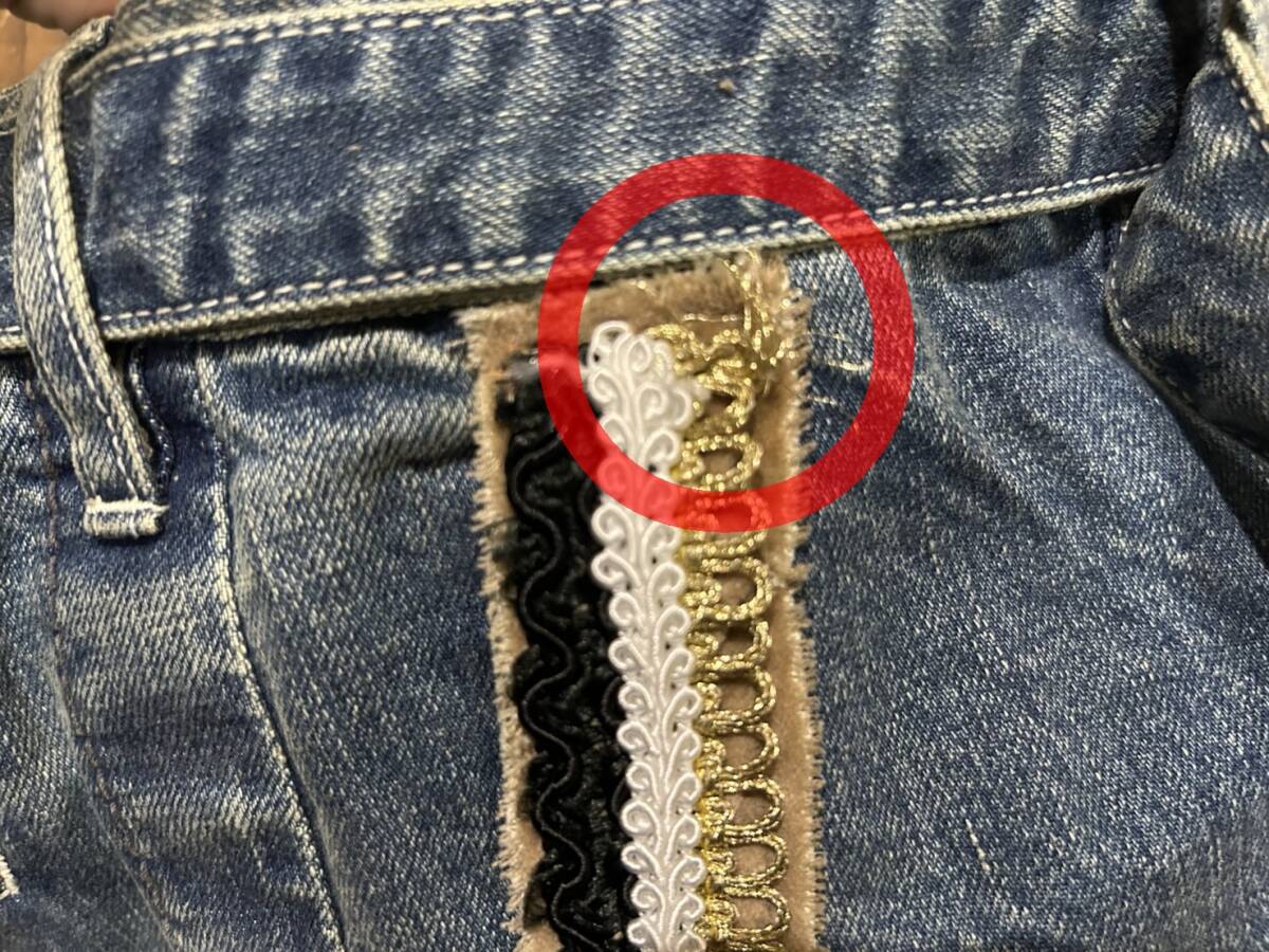 ポケット口、ベルト刺繍に若干飾り糸解れがございます。