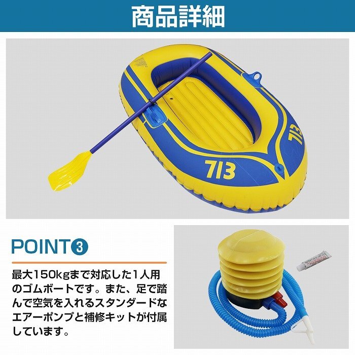 最大150kgまで対応した1人用のゴムボートで、海や川での遊具にも最適です。