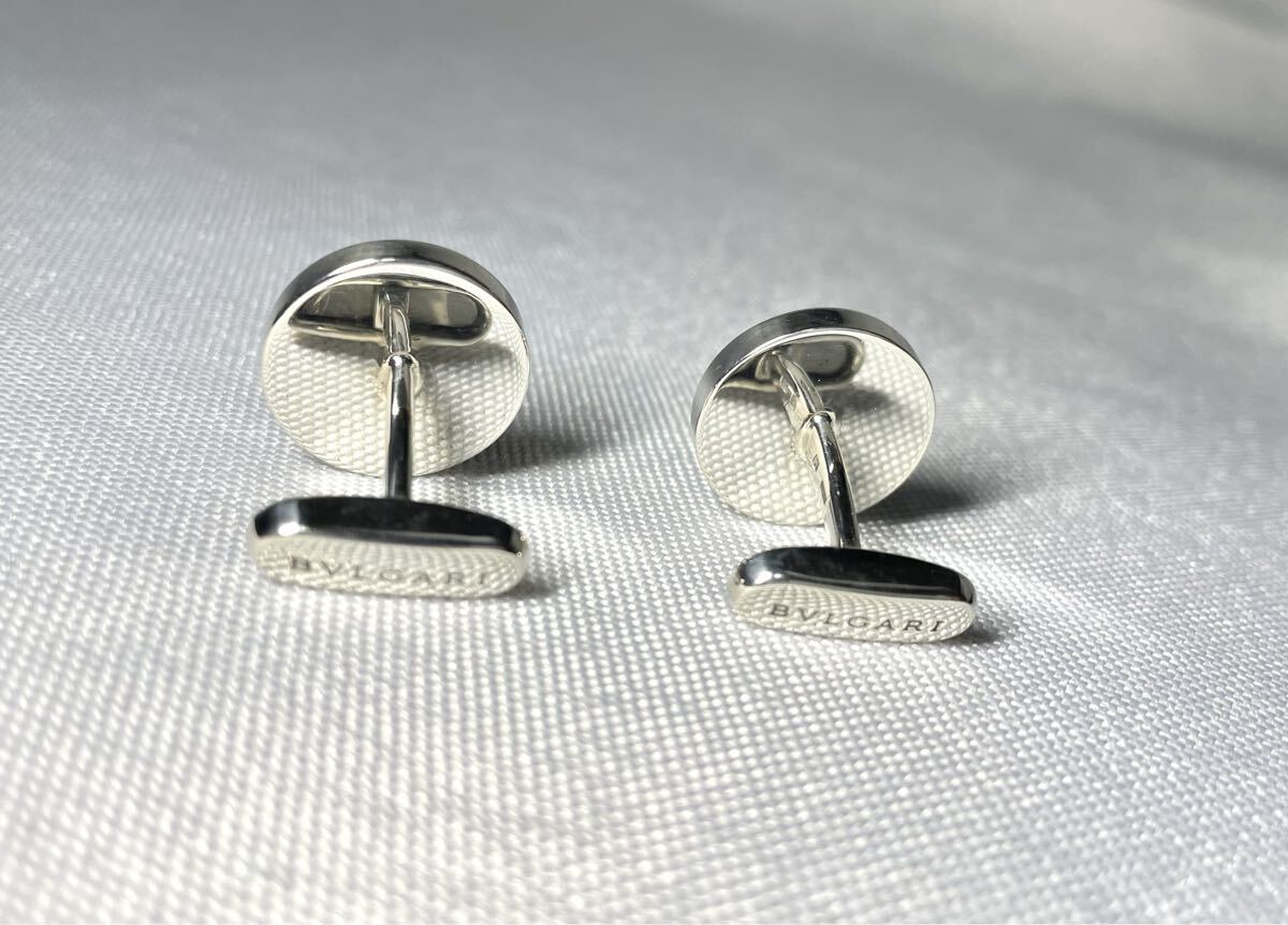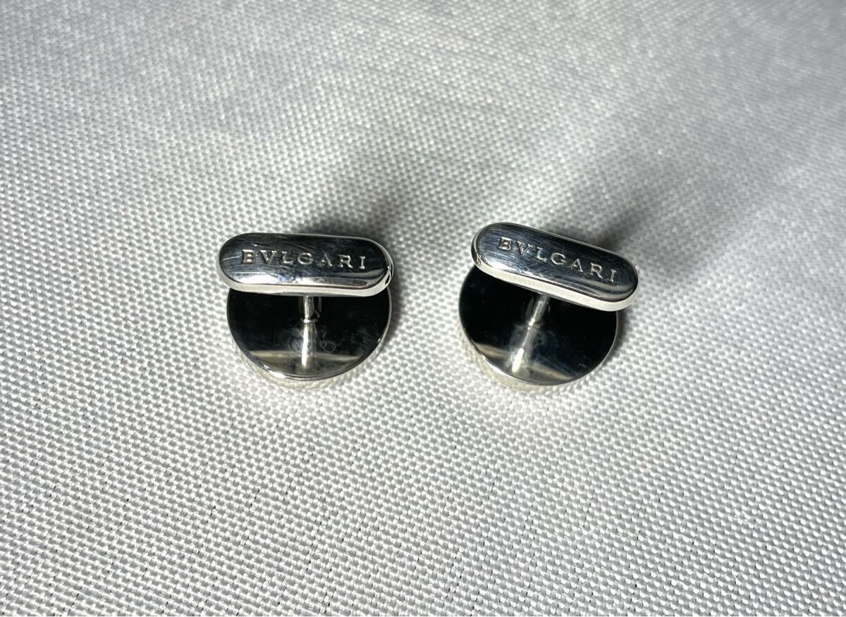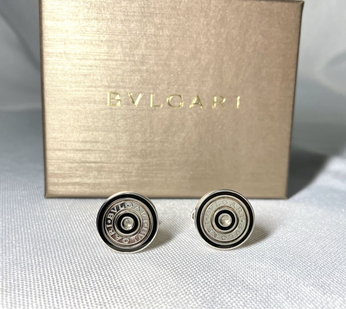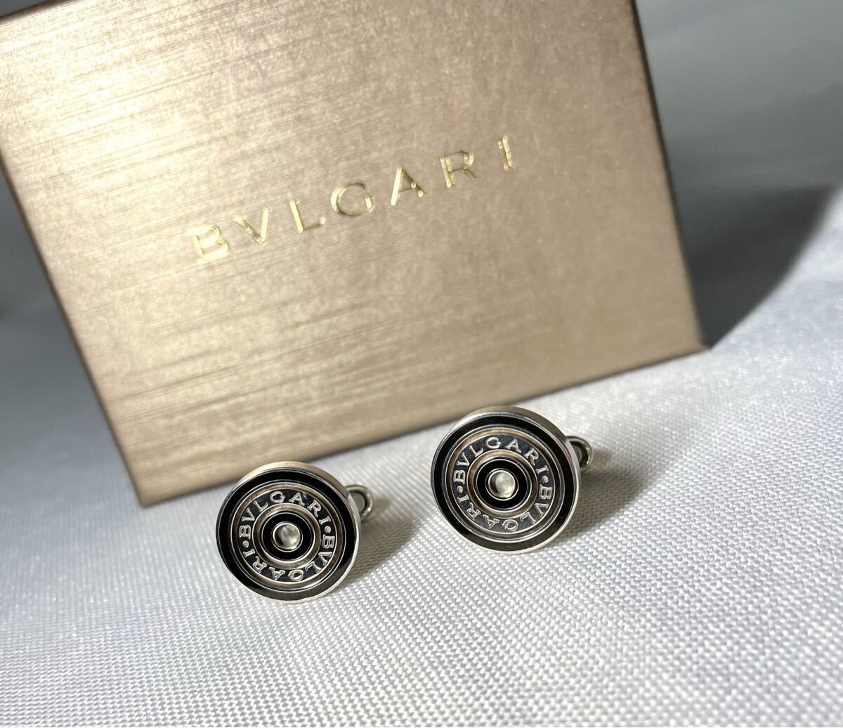 即決美品 BVLGARI ブルガリ ブランドロゴ文字 スターリングシルバー & ブラックライン オーバルカフス カフリンクス ボタン SV925 箱あり