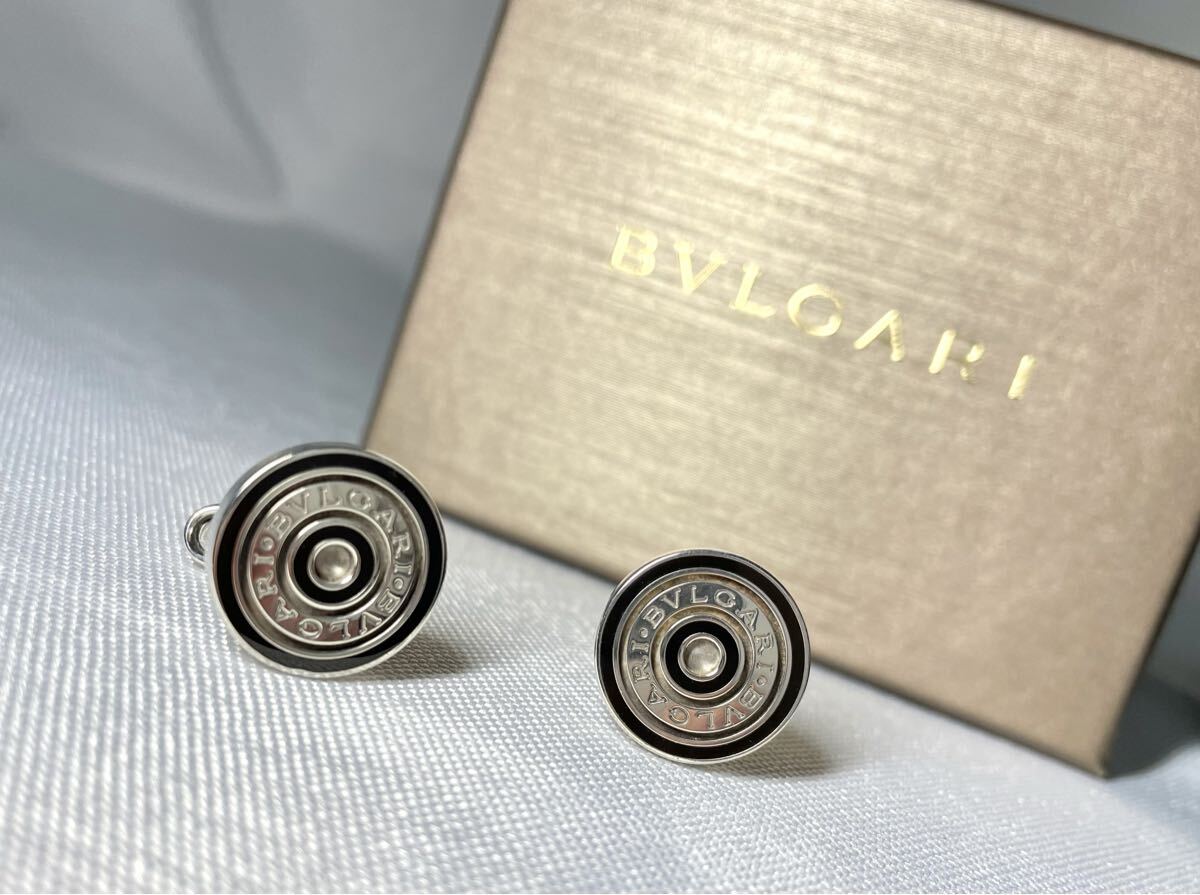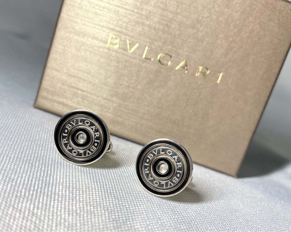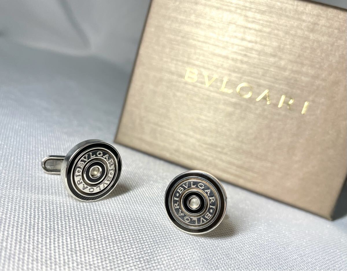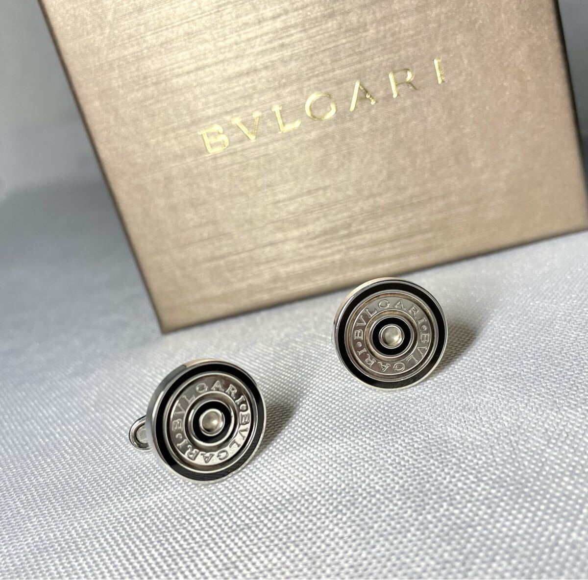 即決美品 BVLGARI ブルガリ ブランドロゴ文字 スターリングシルバー & ブラックライン オーバルカフス カフリンクス ボタン SV925 箱あり