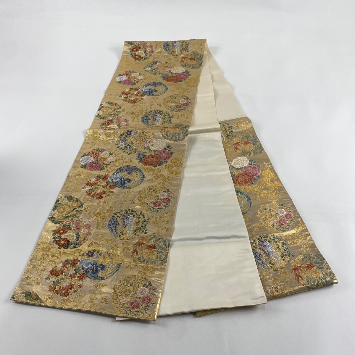 | 袋帯 秀品 関西仕立て 花丸文 秋草 金糸 箔 金色 六通 正絹 【中古】 |