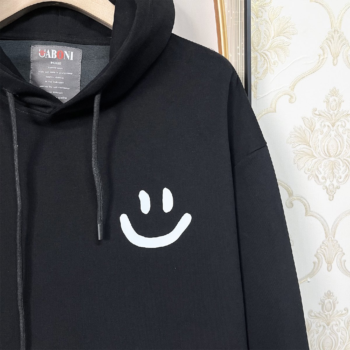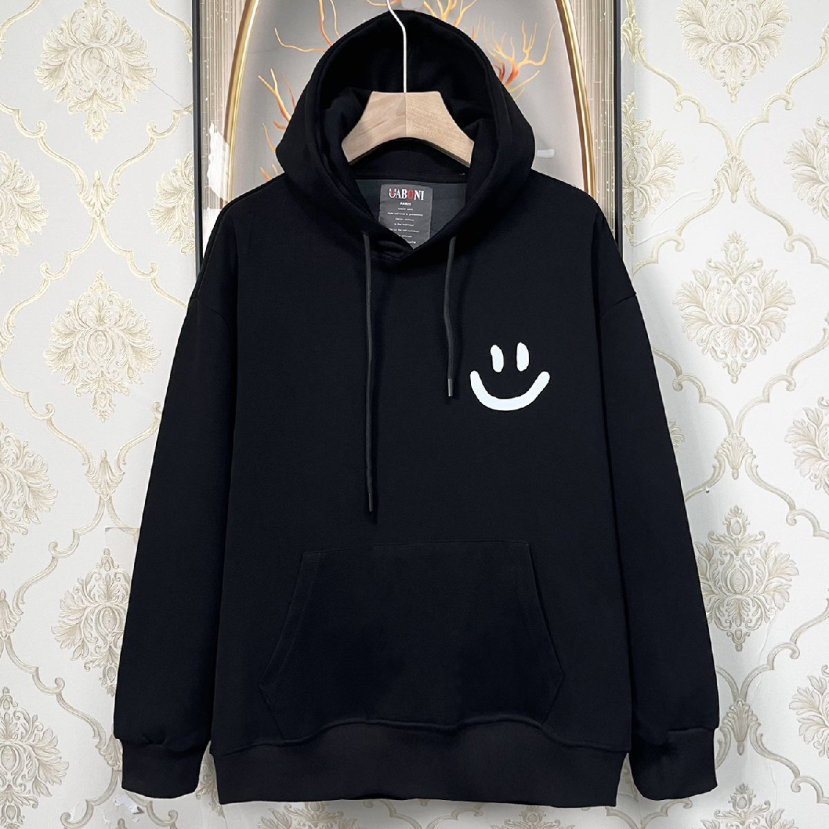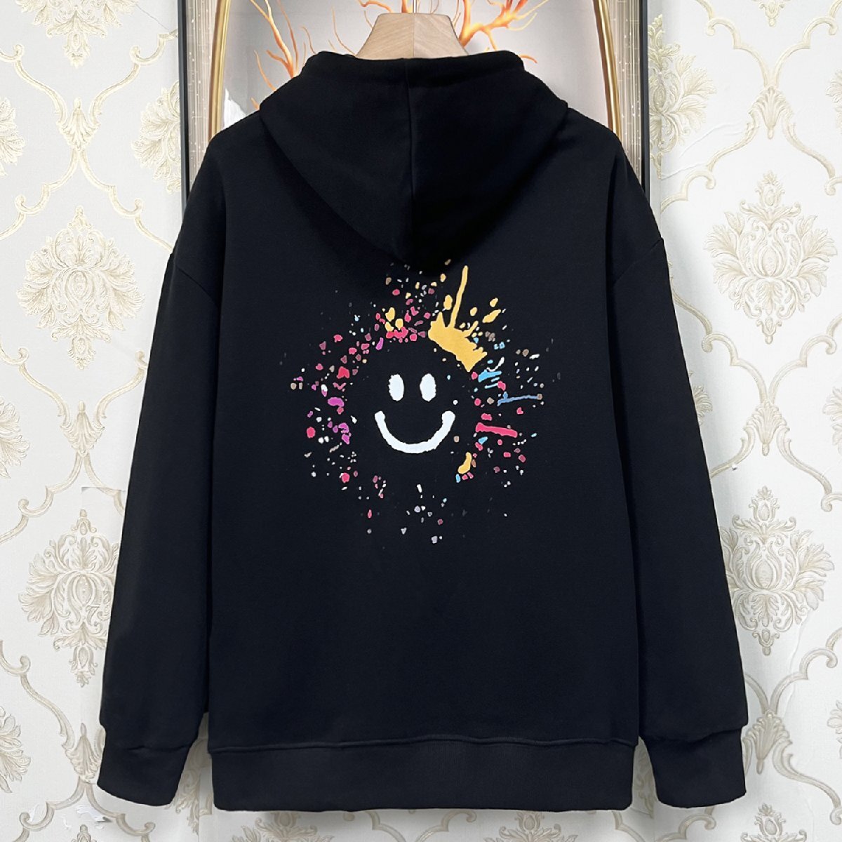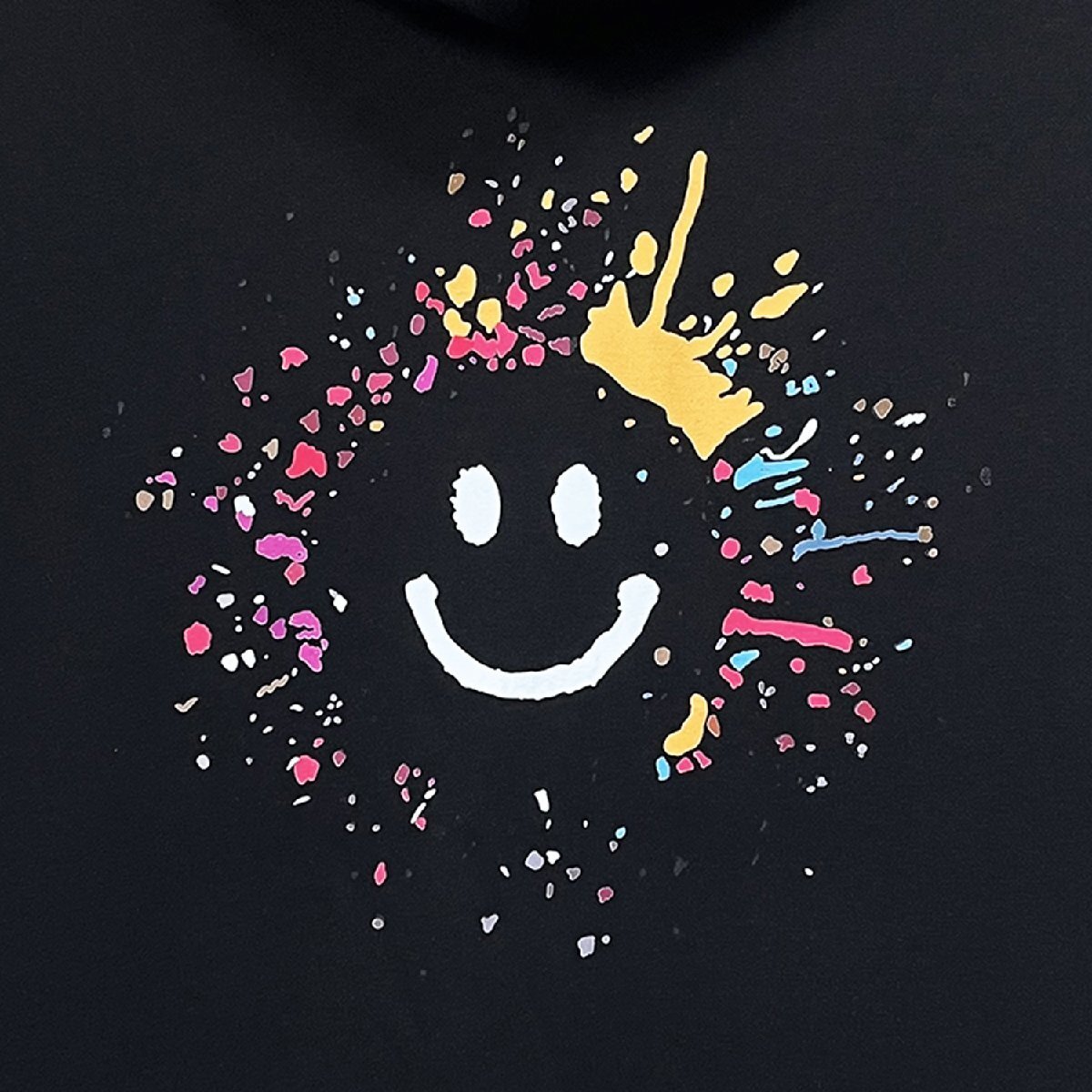 ベーシックで合わせやすいカラーなので様々な色のボトムスとも相性ばっちりです。近年流行りの大きなプリントデザインとして、バックには可愛い笑顔のプリントが施され、やる気満々の雰囲気を作り出し、笑顔の周りのカラフルなスプラッシュデザインはストリート感を演出します。左胸にも笑顔があり、さり気なくアクセントになります。フロントは収納に便利なカンガルーポケットをレイアウト、デザインにも質感も拘り抜いた逸品。趣向を凝らしたデザインはどんなシーンでも魅力を際立たせます。また、袖口も裾もリブが付いているので、きつくなくてちょうどいい感じです。