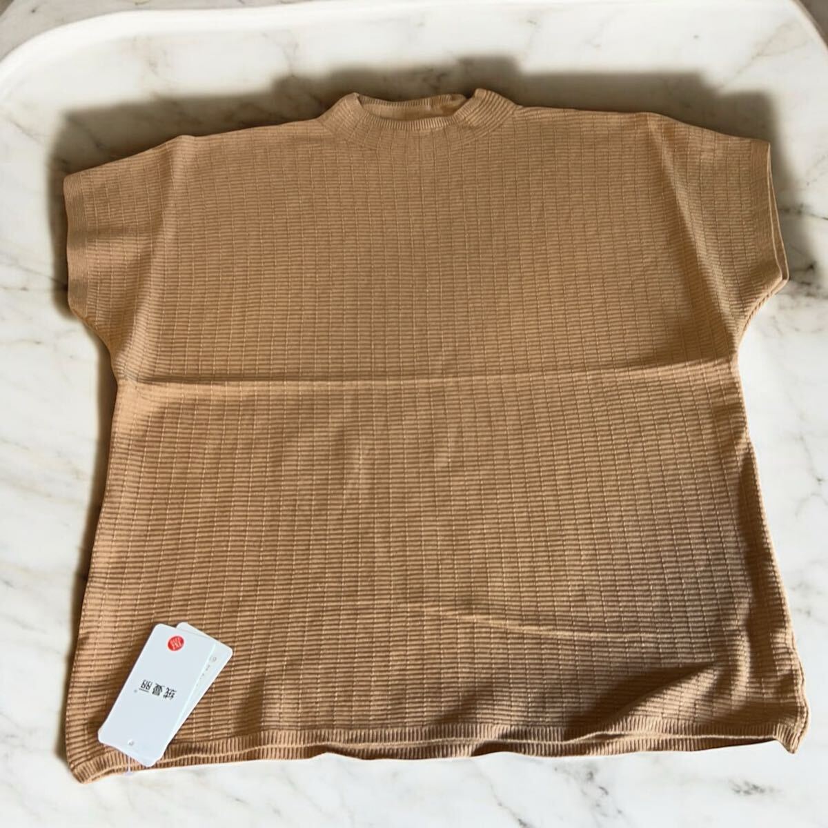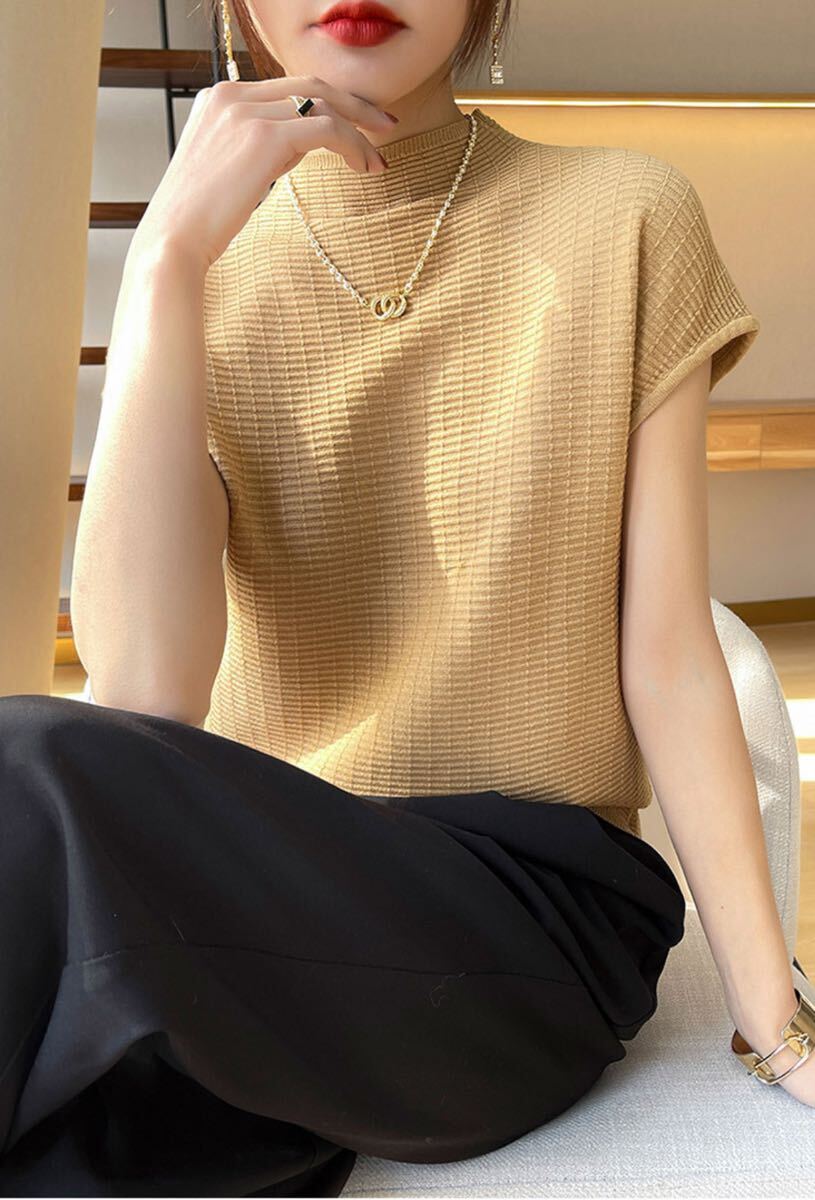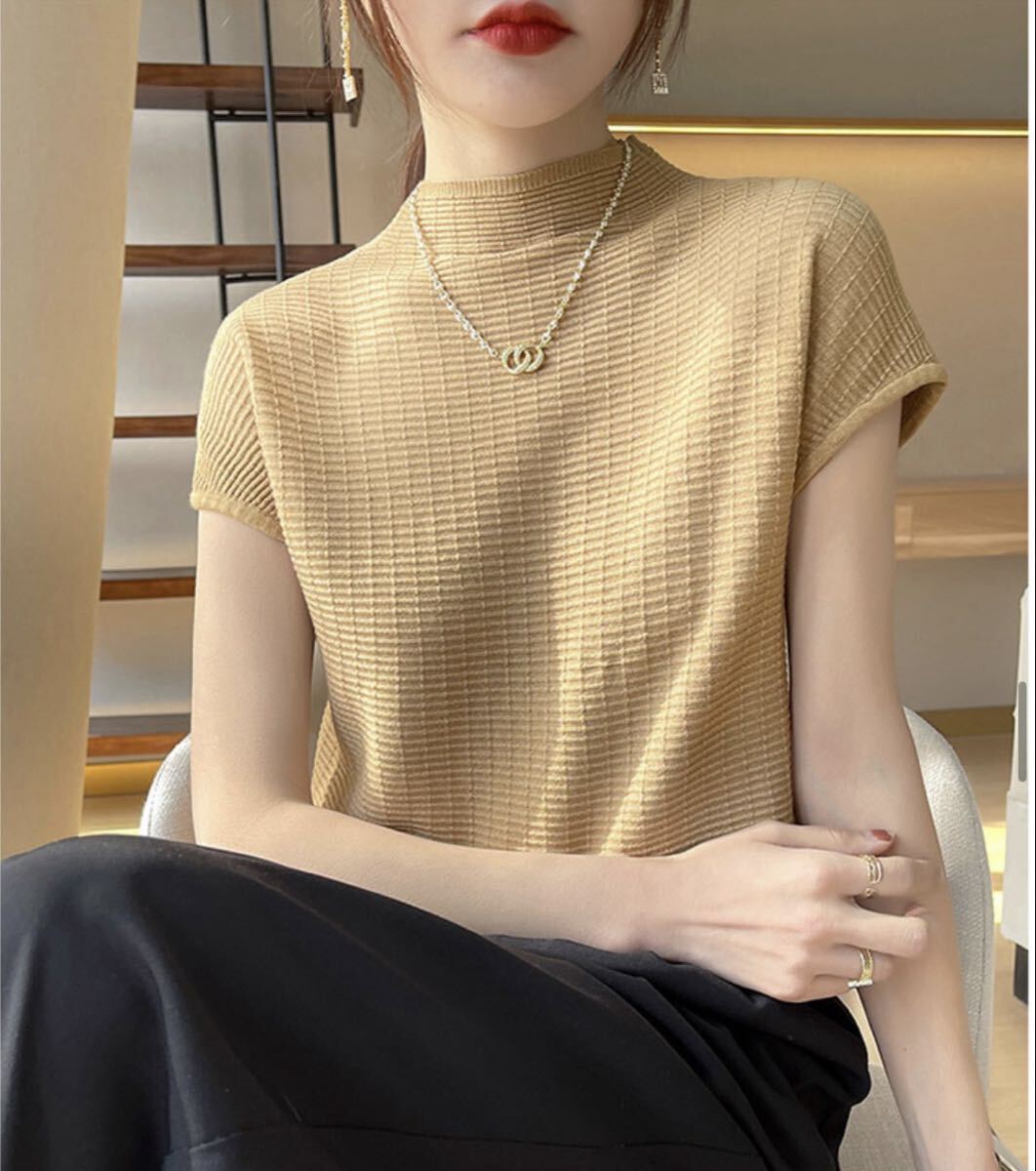 肩や二の腕のラインをすっきり見せるフレンチスリーブと、上品なモックネックデザインが特徴。軽やかな素材で通気性が良く、暑い季節にぴったりです。