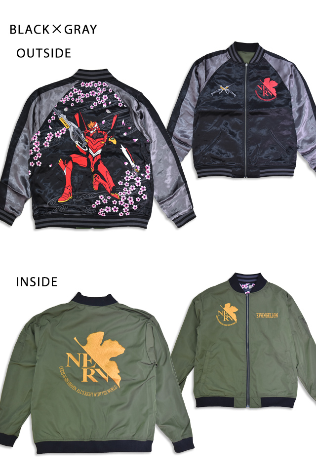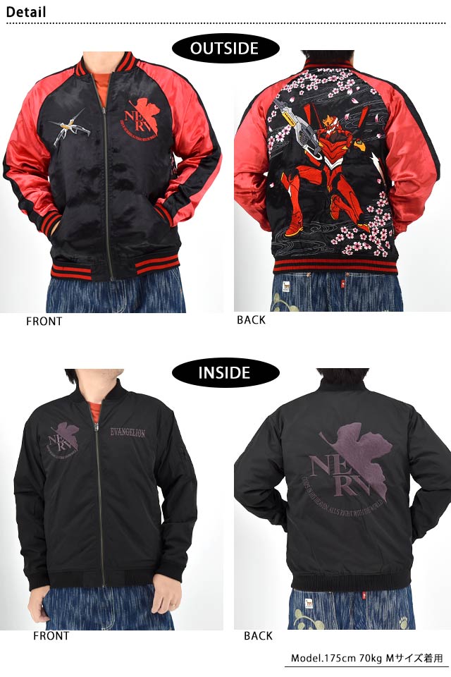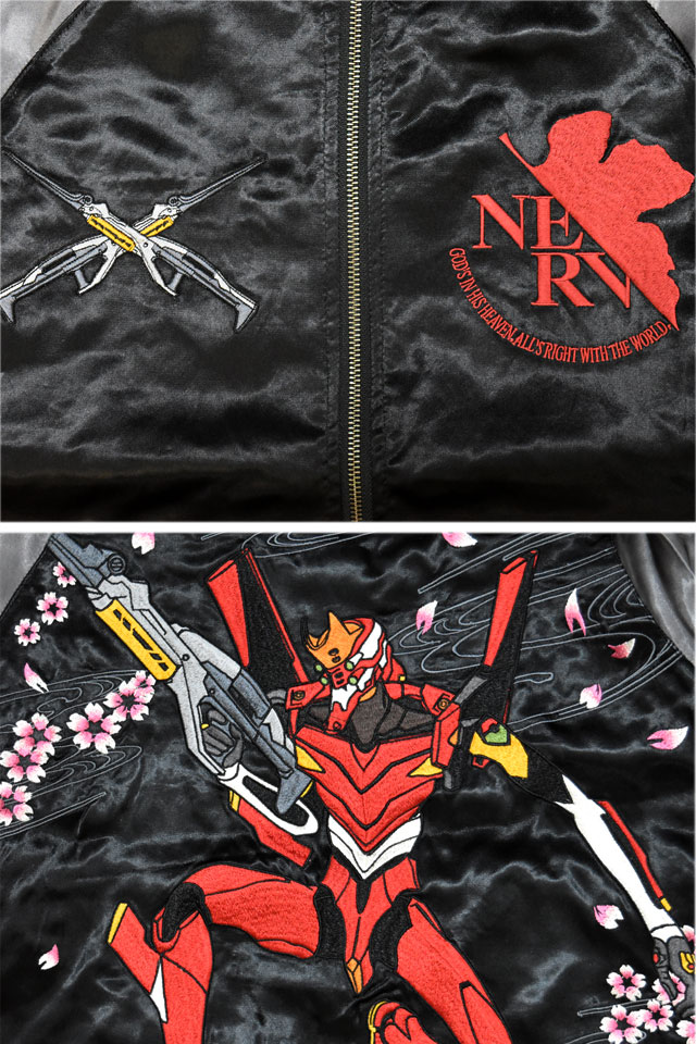 新感覚のオリエンタルブランド、錦さんから「EVANGELION×錦 桜流水2号機リバーシブルMA-1スカジャン(595351)」のご紹介です。 大人気コンテンツ「ヱヴァンゲリヲン」と錦のコラボシリーズから、最新作が登場!! 光沢感となめらかなドレープ性により高級感溢れるレーヨン素材を使用したベースボディに、刺繍をふんだんに用いたハイクオリティなリバーシブルスカジャンとなります。 リバーシブル面はミリタリージャケットになっており、袖にはポケットが縫い付けられています。 表面には桜流水の中で佇む2号機を、裏面にはネルフマークをそれぞれデザインしました。 1枚持っているだけでずっと使えるスカジャン。 | ||||||||||||||||||||