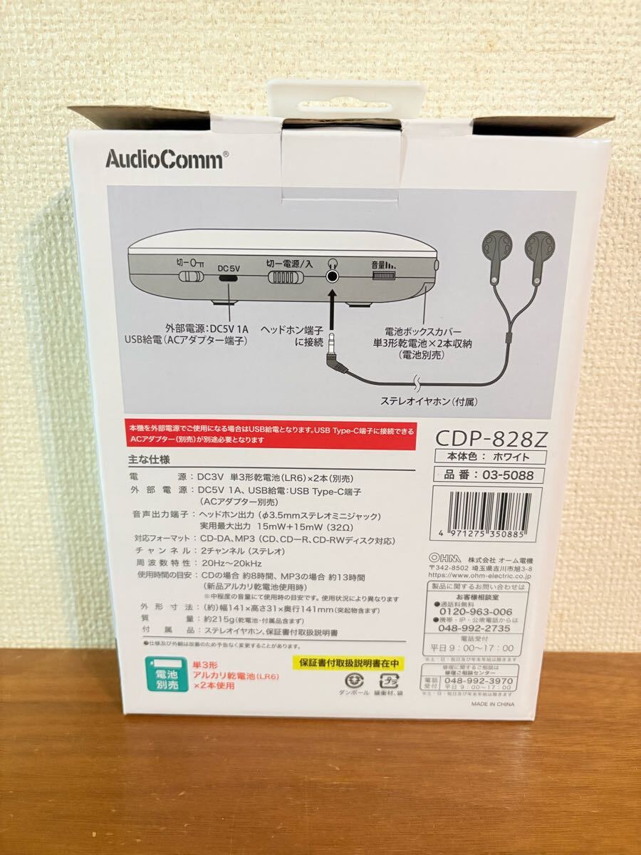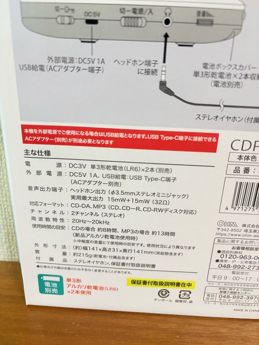 【 仕 様 】 ◆電源:DC3V単3形乾電池(LR6)×2本(別売) ◆外部電源:DC5V 1A、USB給電…USB Type-C端子(ACアダプター別売) ◆音声出力端子:ヘッドホン出力(φ3.5mmステレオミニジャック)、実用最大出力 15mW+15mW(32Ω) ◆対応フォーマット:CD-DA、MP3(CD、CD-R、CD-RWディスク対応)