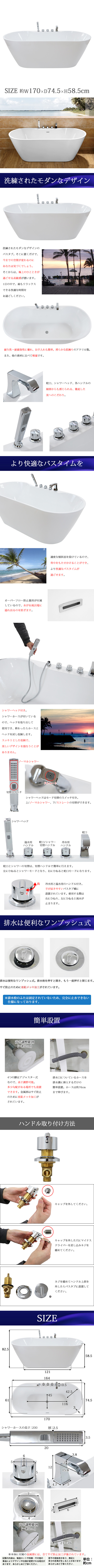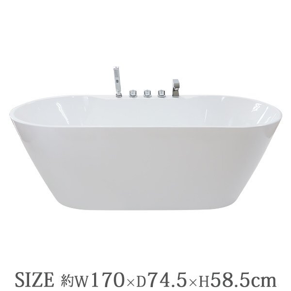 | 商品名 | 送料無料 新品 バスタブ W170×D74.5×H58.5cm 浴槽 バス お風呂 洋風バスタブ 風呂 置き型 据え置き 洋式 アクリル製 シャワーヘッド 蛇口 おしゃれ オーバーフロー防止 ワンプッシュ式 排水栓 ホワイト bath-203 |