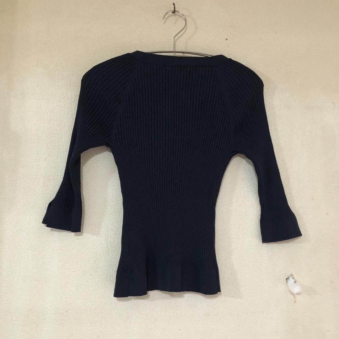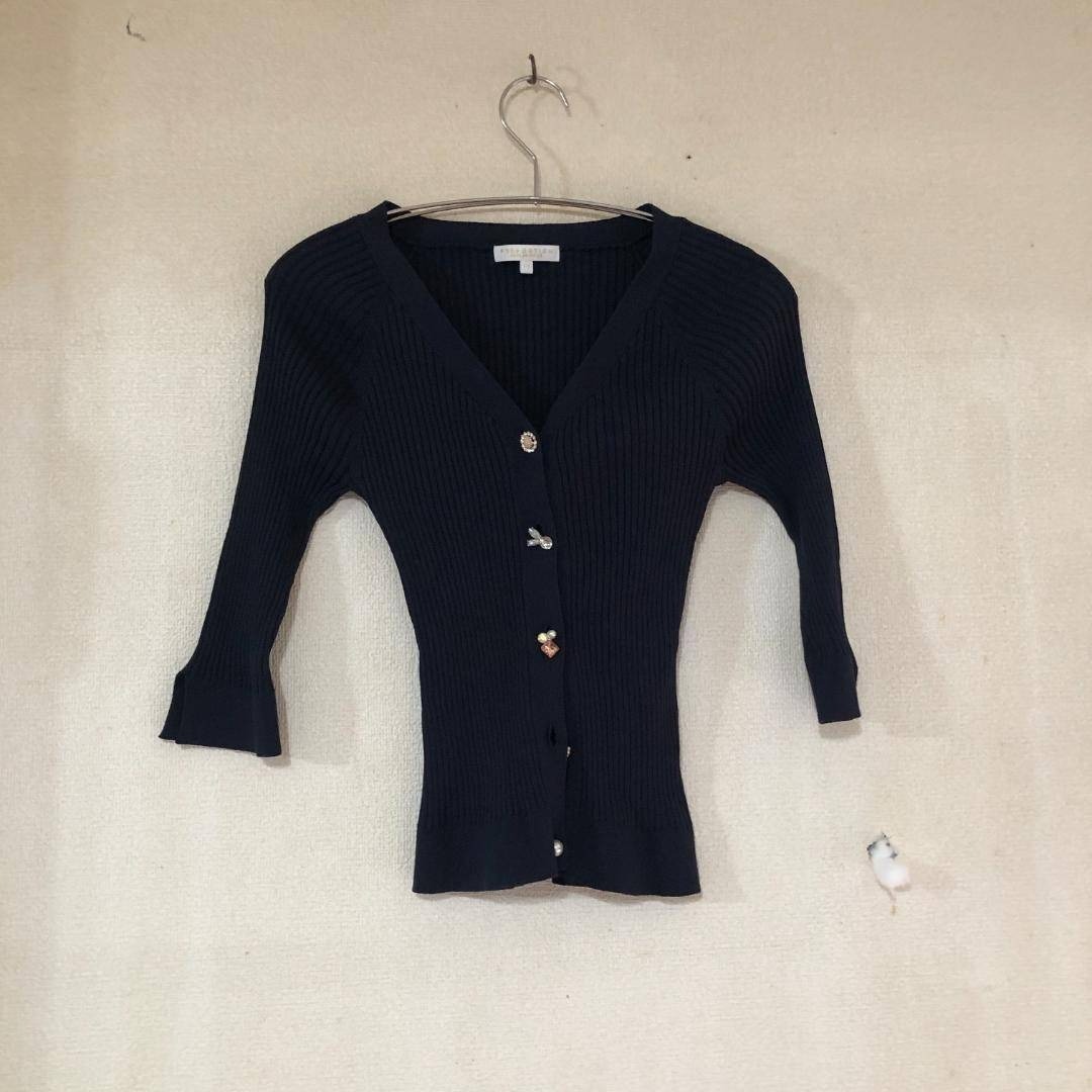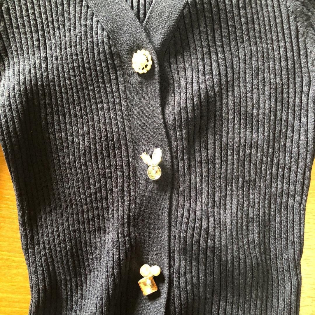 ビジューボタン リブニットカーディガン 7分袖 ネイビー トップス B2007