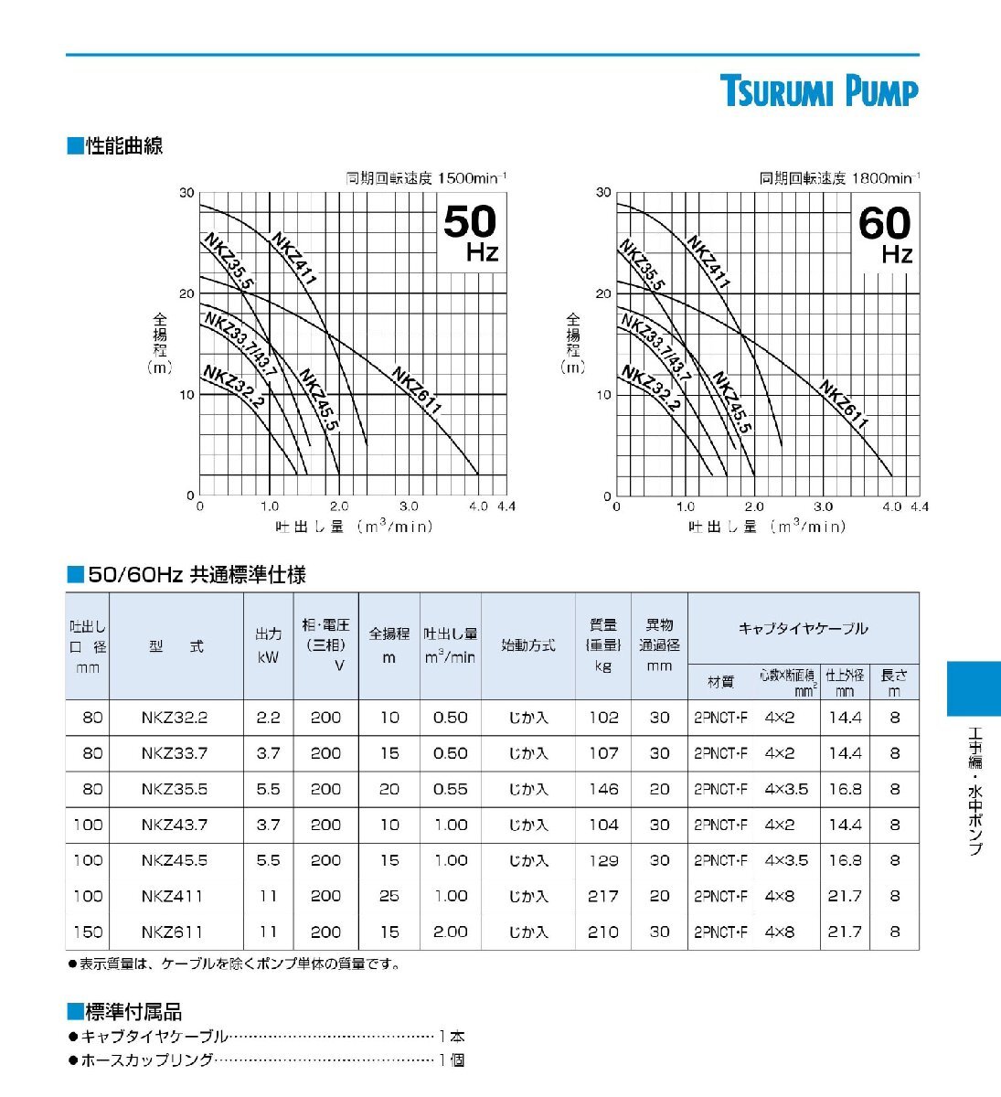 〈ツルミ〉NKZ33.7 50Hz 東日本用 サンド用 水中ポンプ NKZ型 口径80mm 出力3.7kw ツルミポンプ 代引不可