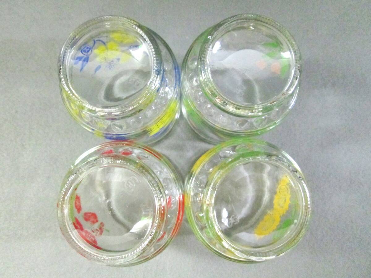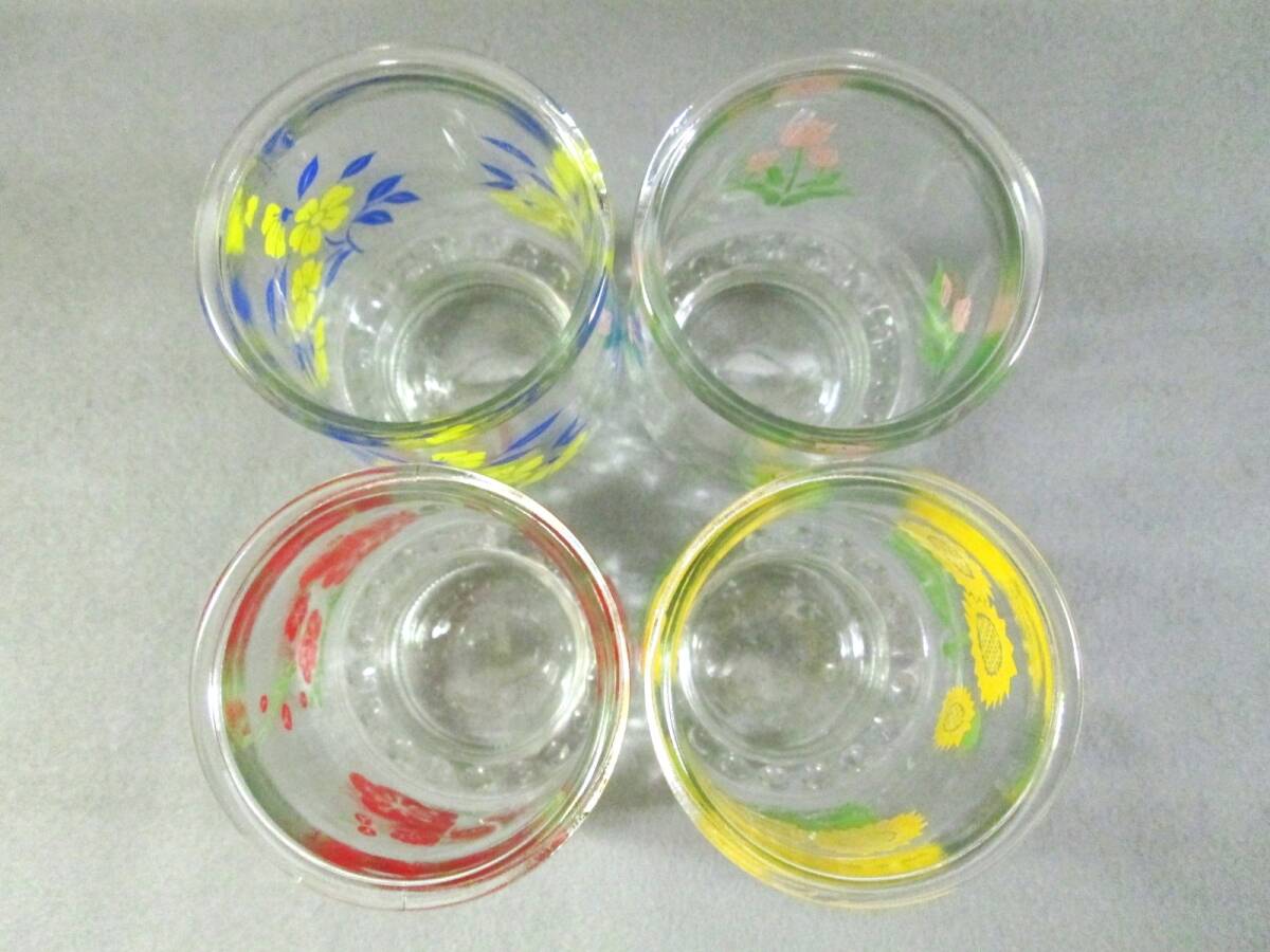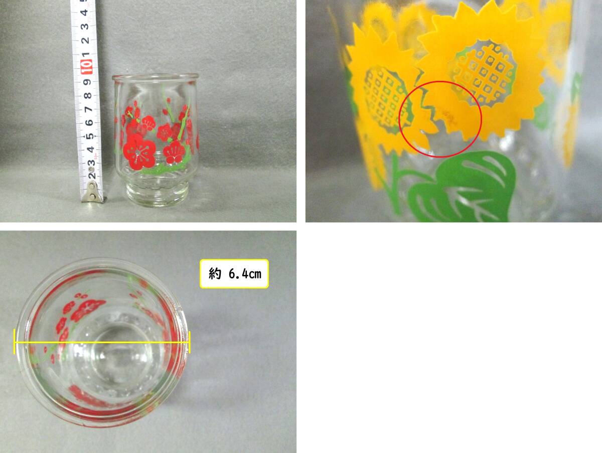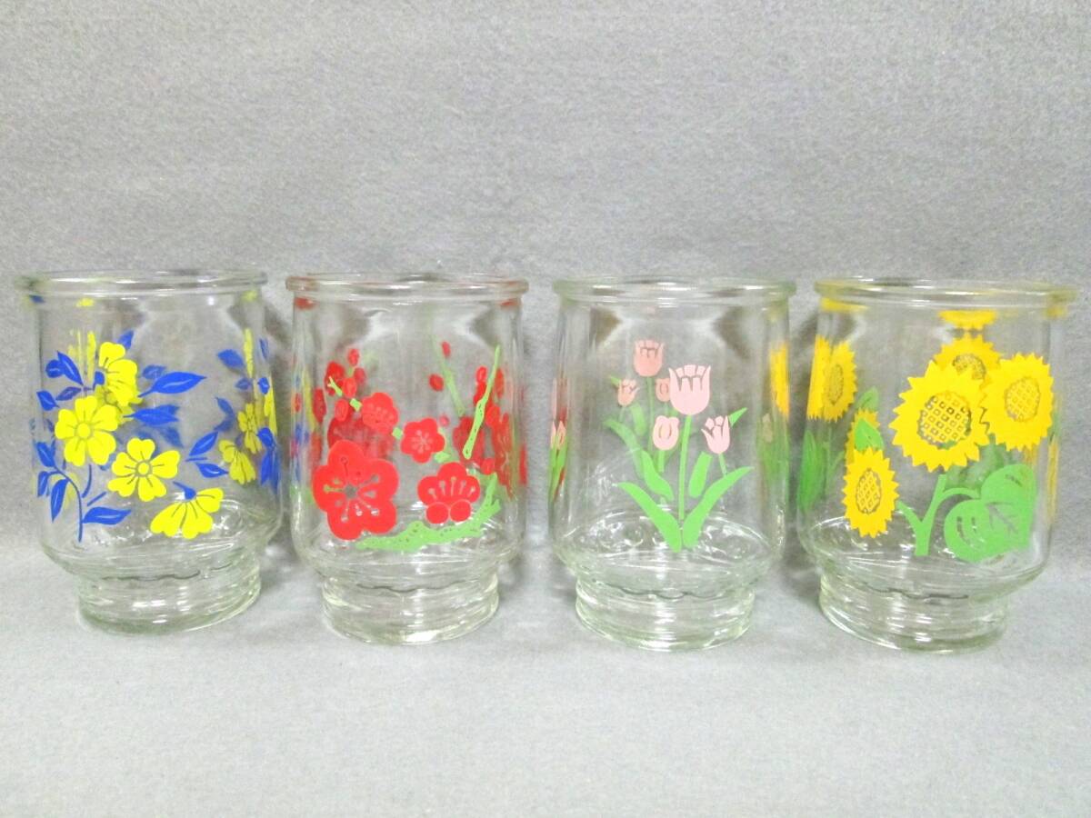 昭和レトロ ワンカップ ガラス コップ 4個セット 花柄 梅の花 チューリップ ひまわり 硝子 グラス ②