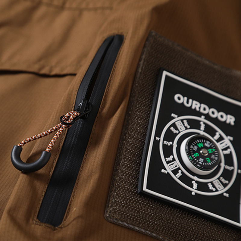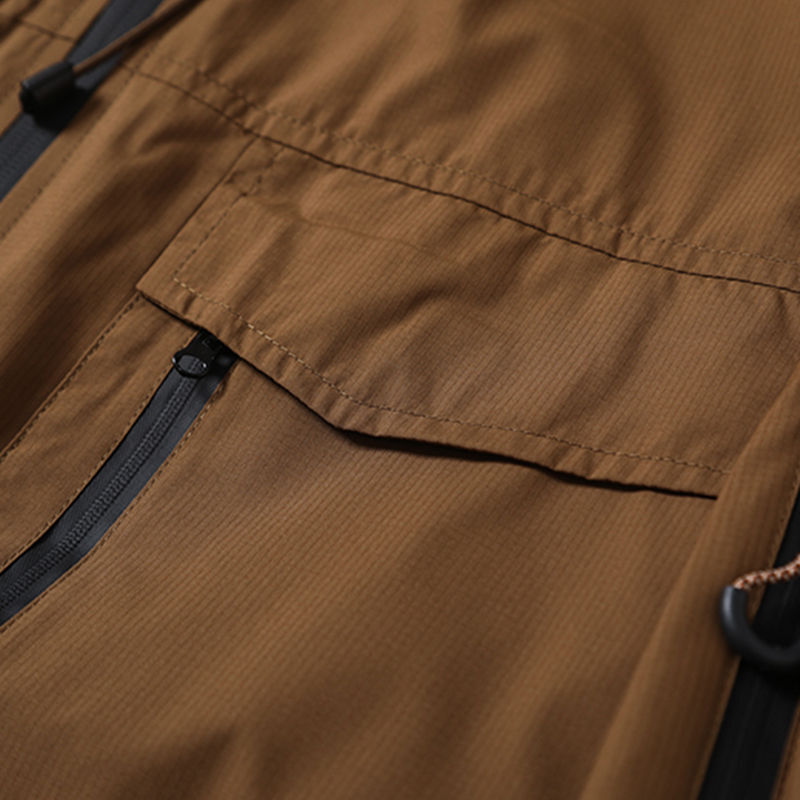 胸元と両サイドにジッパー付きポケットを配置。スマホや財布、小物類を安全に収納可能で、手ぶらでも安心。