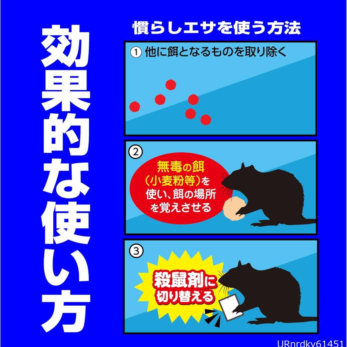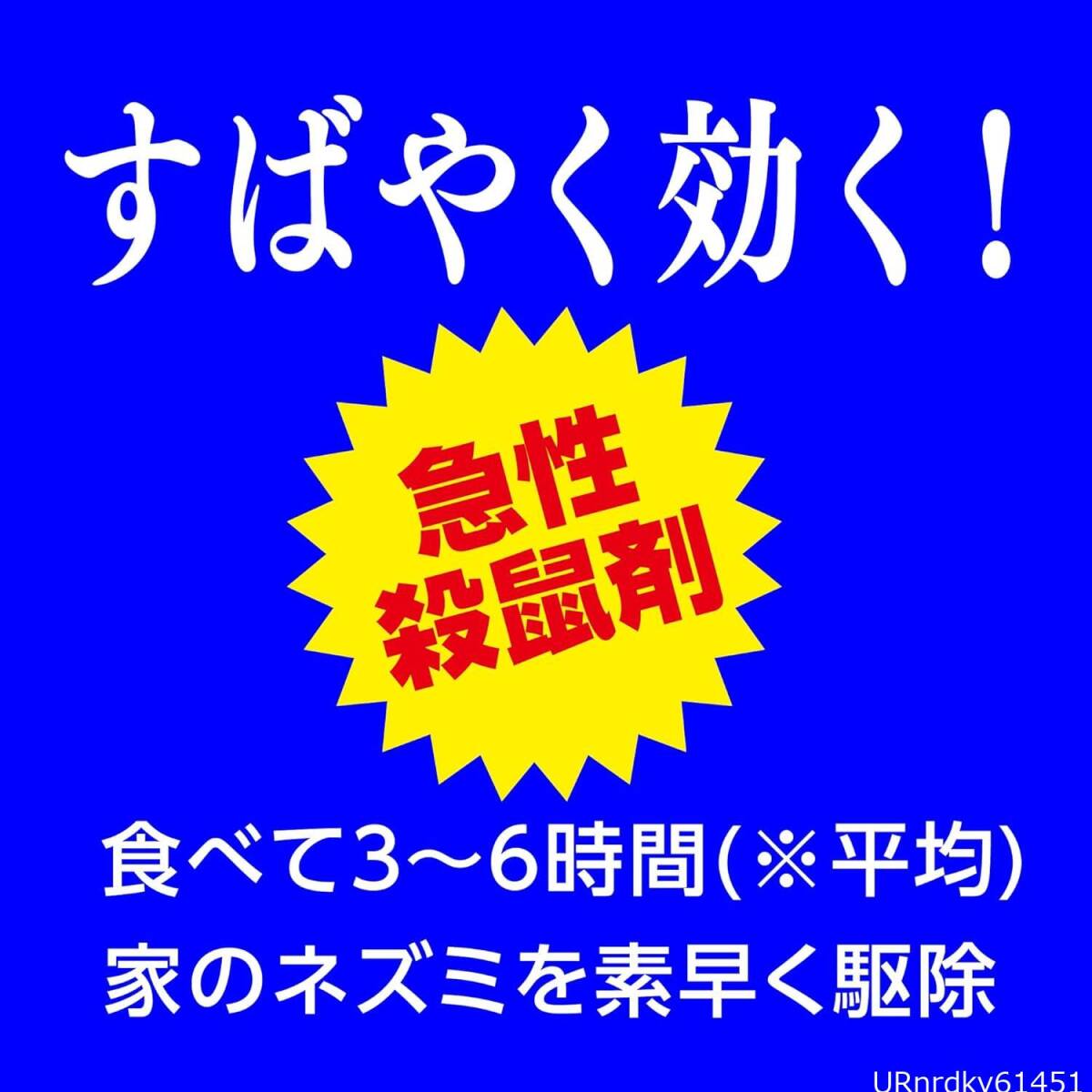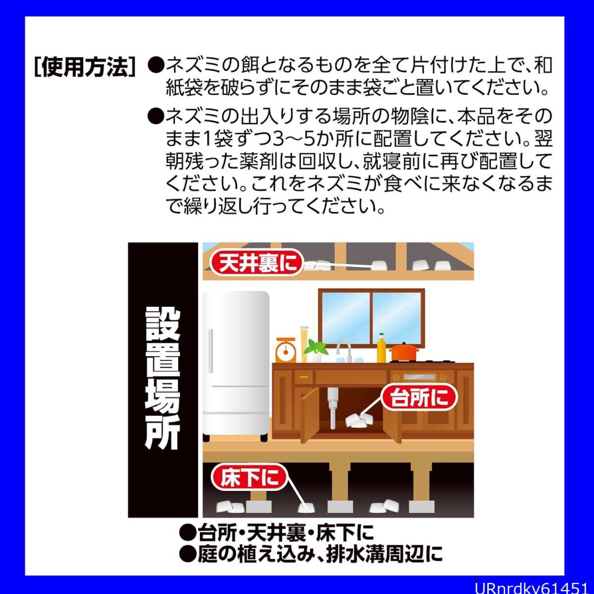 【便用万法】 ●ネズミの餌となるものを全て片付けた上で、和紙袋を破らずにそのまま袋ごと置いてください。 ●ネズミの出入りする場所の物陰に、本品をそのまま1袋ずつ3~5か所に配置してください。翌朝残った薬剤は回収し、就寝前に再び配置してください。これをネズミが食べに来なくなるまで繰り返し行ってください。