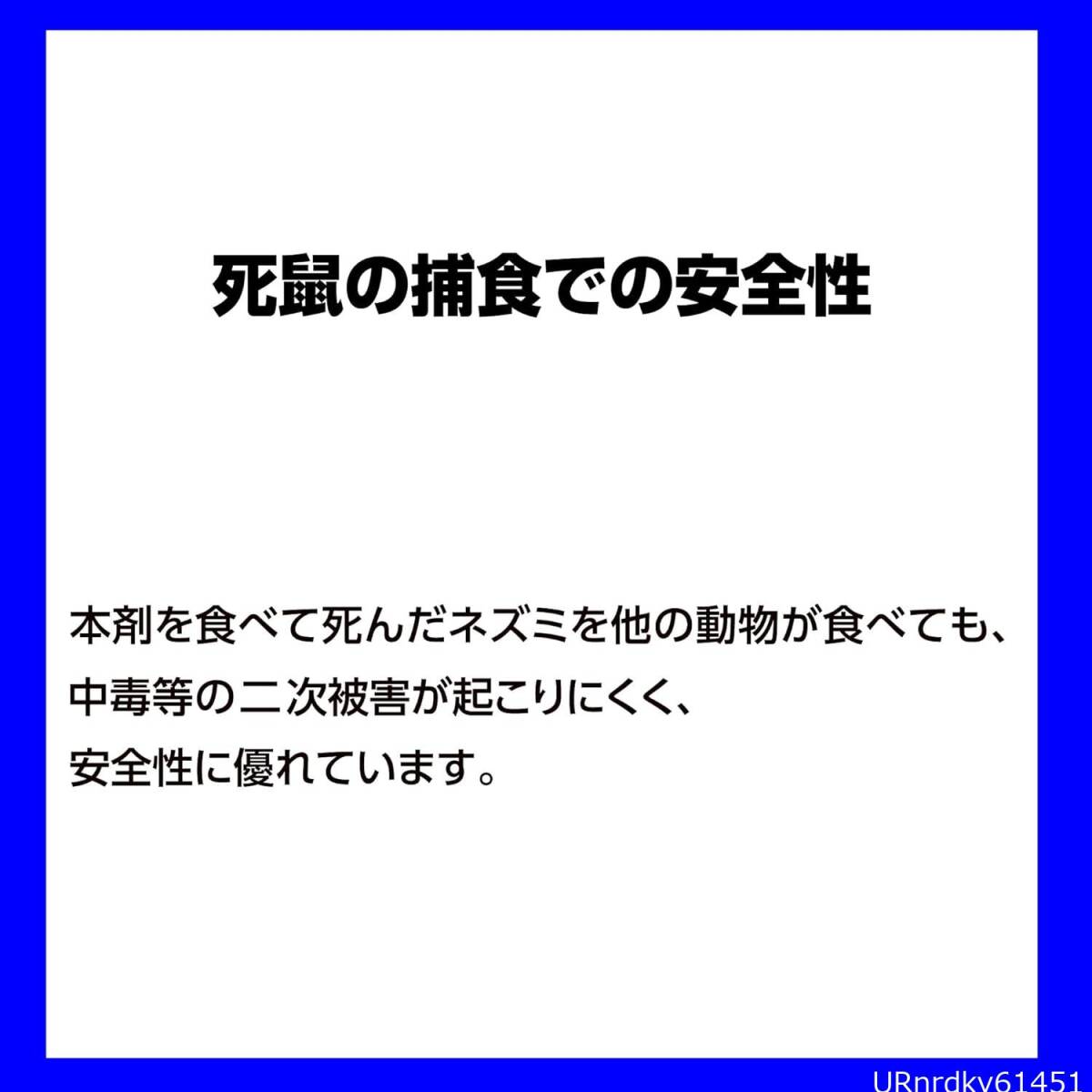 【使用上保管上の注意】 ●人間や家畜には有害のため、使用ならびに保存には十分に注意し、万一誤って食べた場合は吐き出させ、直ちに本品がリン化亜鉛製剤であることを医師に告げ、診療を受けること。 ●台所等室内には就寝前に配匿し、翌朝残った薬剤は回収すること。 ●薬剤が手についたときは石けんと水でよく洗うこと。 ●食品・食器・飼料等と区別し、小児の手の届かない湿気の少ない冷暗所で保管すること。 ●本品は酸類に触れると有毒なリン化水素を発生するので、酸類には絶対に近づけないこと。 ●廃棄の際は、自治体の区分に従い廃棄すること。