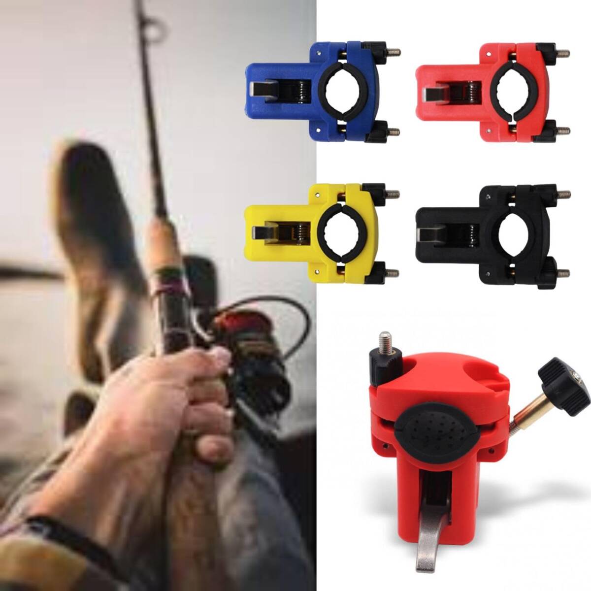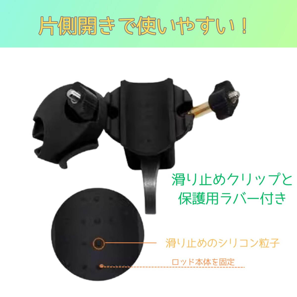 【石鯛釣りに欠かせないロッドスタンドに装着】トリガー式で簡単にロッドを外せます。滑り止めクリップと保護用ラバー付き。コンパクトで携帯にも便利。