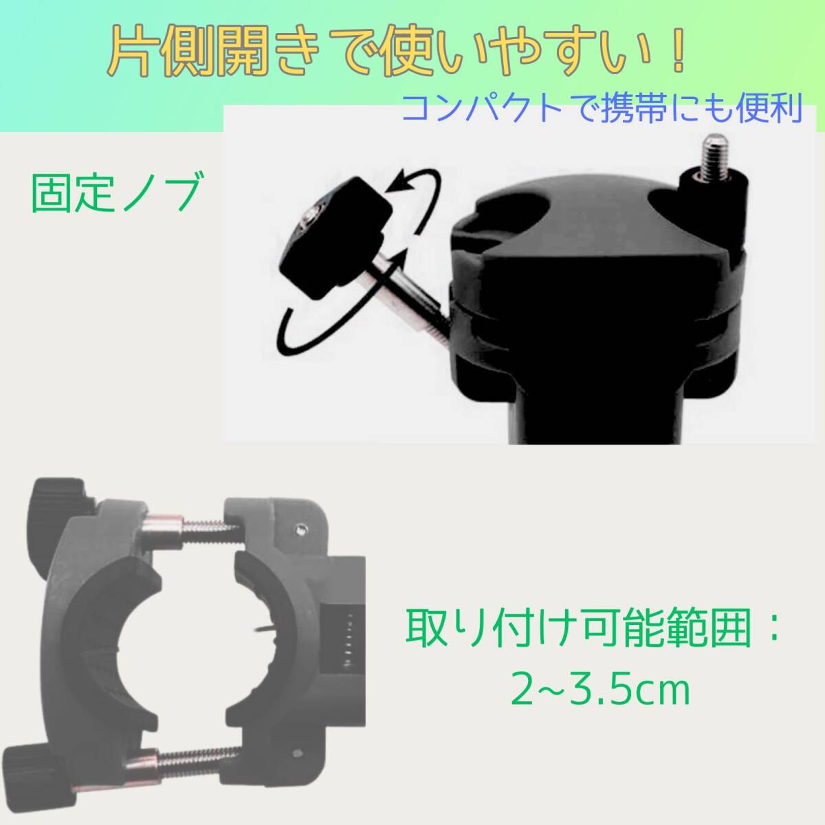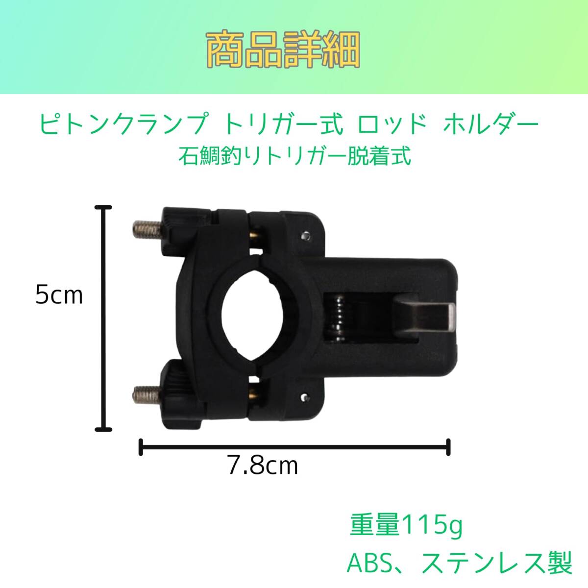 【サイズ・仕様】ピトンクランプのサイズは長さ7.8×幅5cm。釣り竿直径2~3.5cm、ピトン枠径8mm。ABS、ステンレス製。