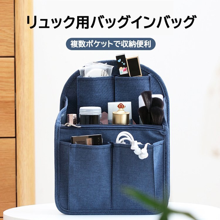 ◆リュック向けバッグインバッグ M L選択可 縦型 自立 大容量 両面マルチ収納 インナーバッグ 仕切りポケット 整理整頓 オックスフォード 軽量 防水 持ち運び便利【ネイビー M】RBIB195