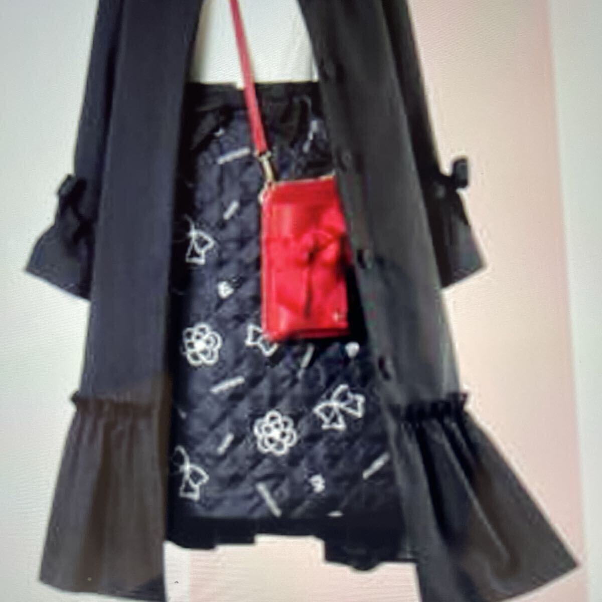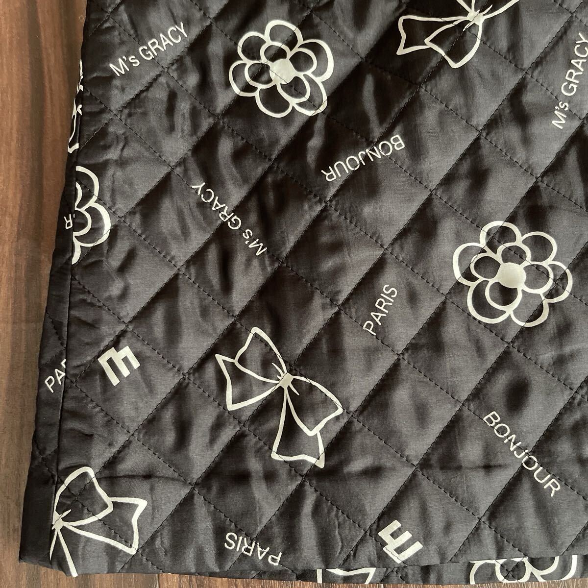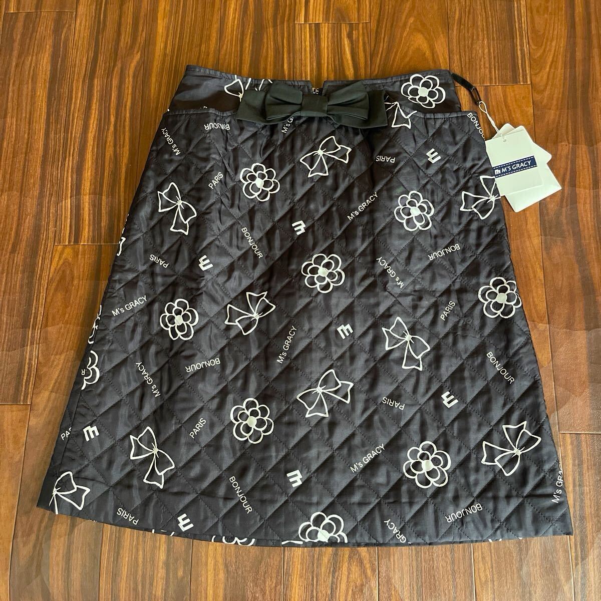 キルティング素材にカメリア、リボン、M’sロゴがプリントされた素敵なスカートです。