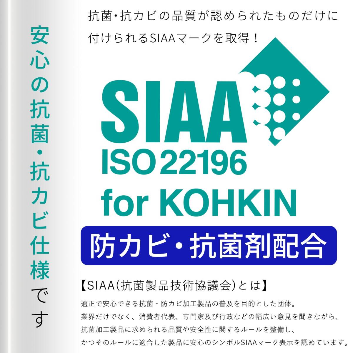 抗菌・防カビの品質が認められたものだけにつけられるSIAAマーク取得。抗菌製品技術協議会が認証した安心の抗菌・防カビ仕様。
