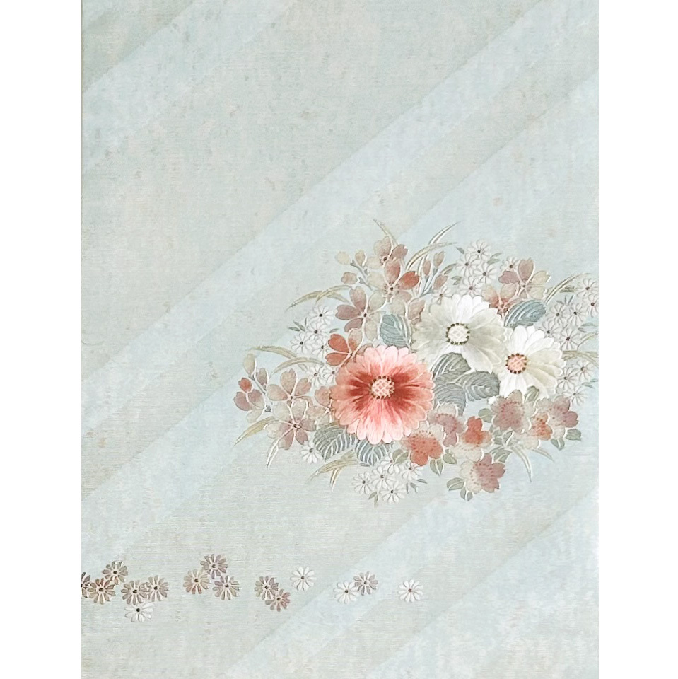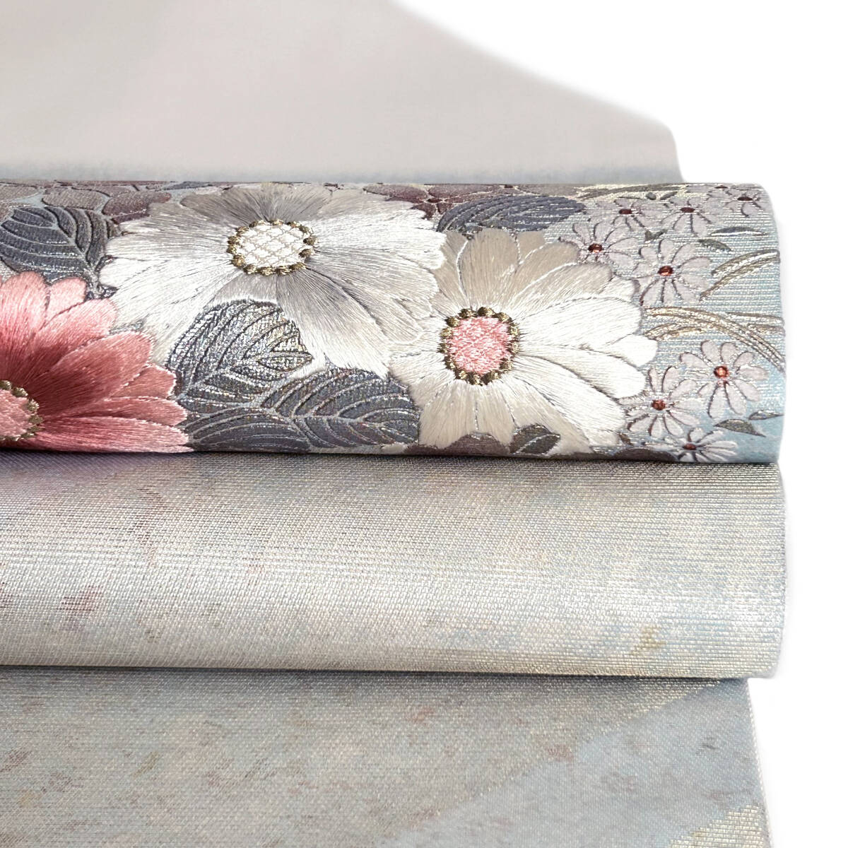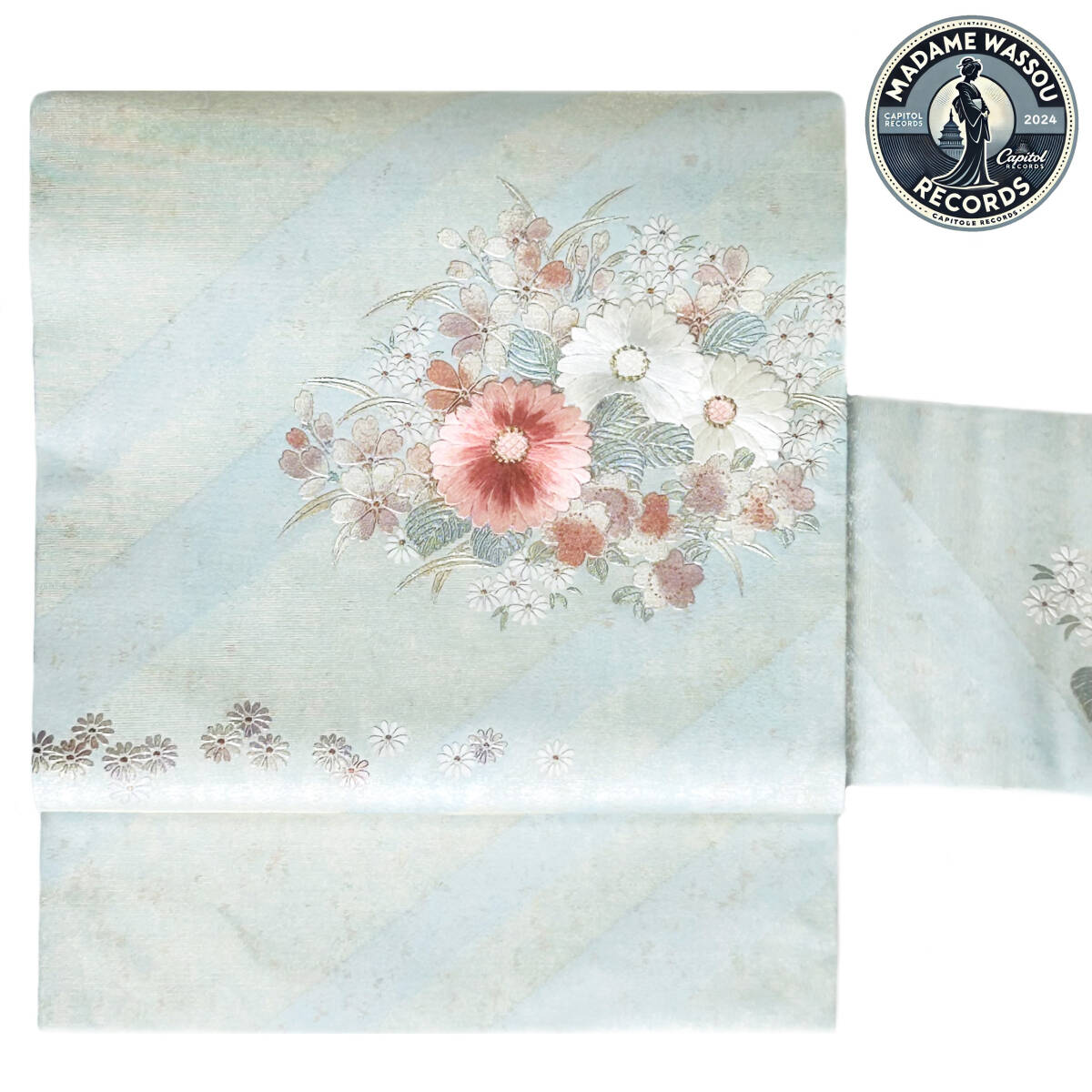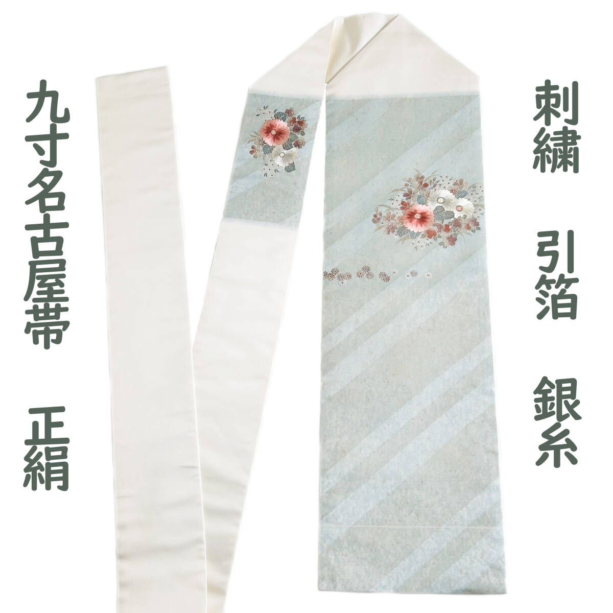 白地にブルーグレーの斜め縞の引箔、そこに銀糸などを用いて菊が刺繍され、梅などのお花が描かれたお色が綺麗な九寸名古屋帯です。どうぞこの機会に是非ご検討下さい!