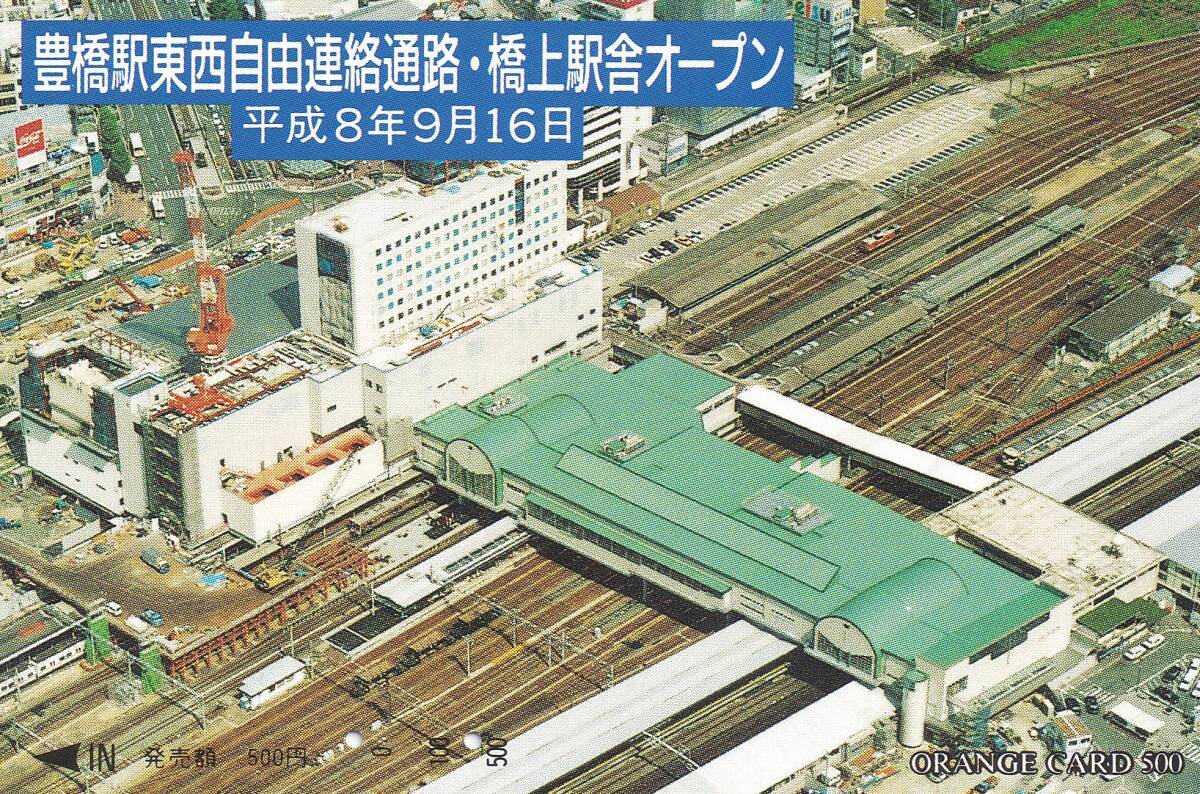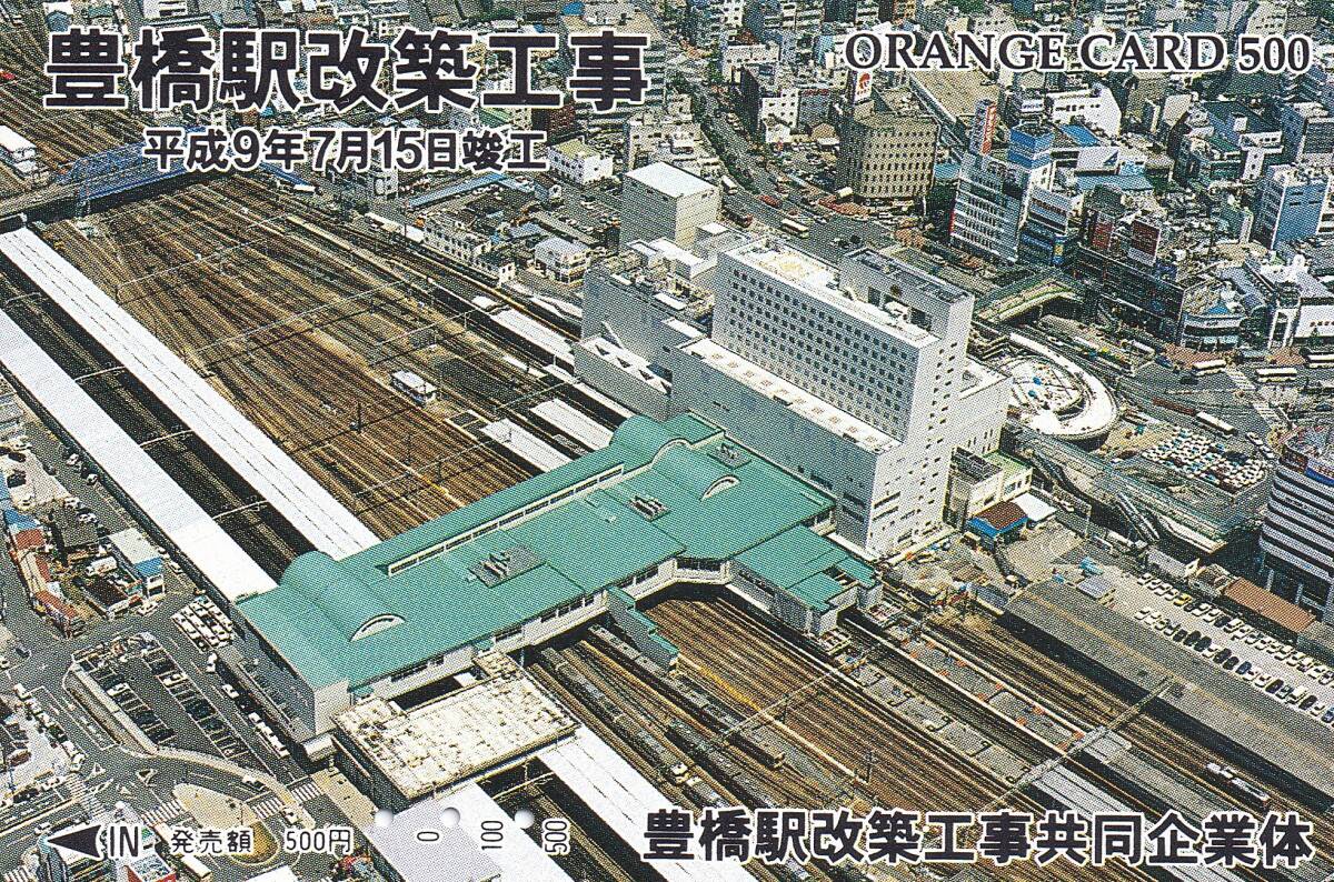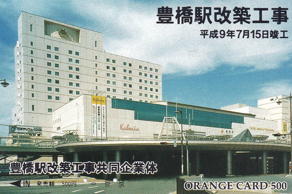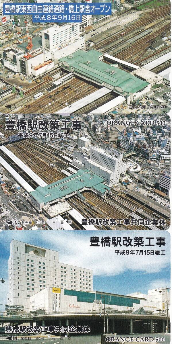 使用済フリーオレンジカード JR東海 豊橋駅東西自由通路・橋上駅舎オープン 豊橋駅改築工事平成9年7月15日竣工 500円券3枚組 説明文参照