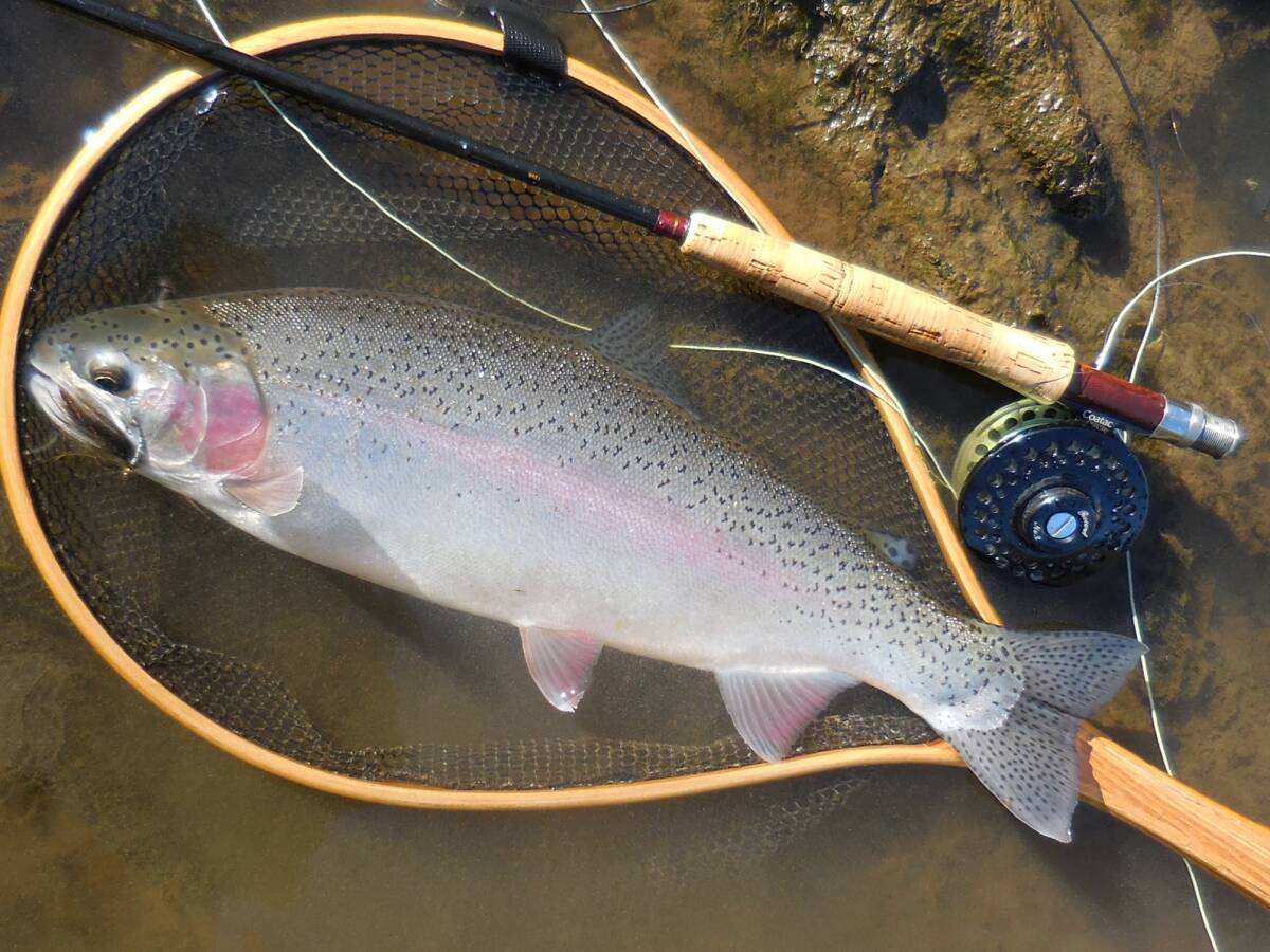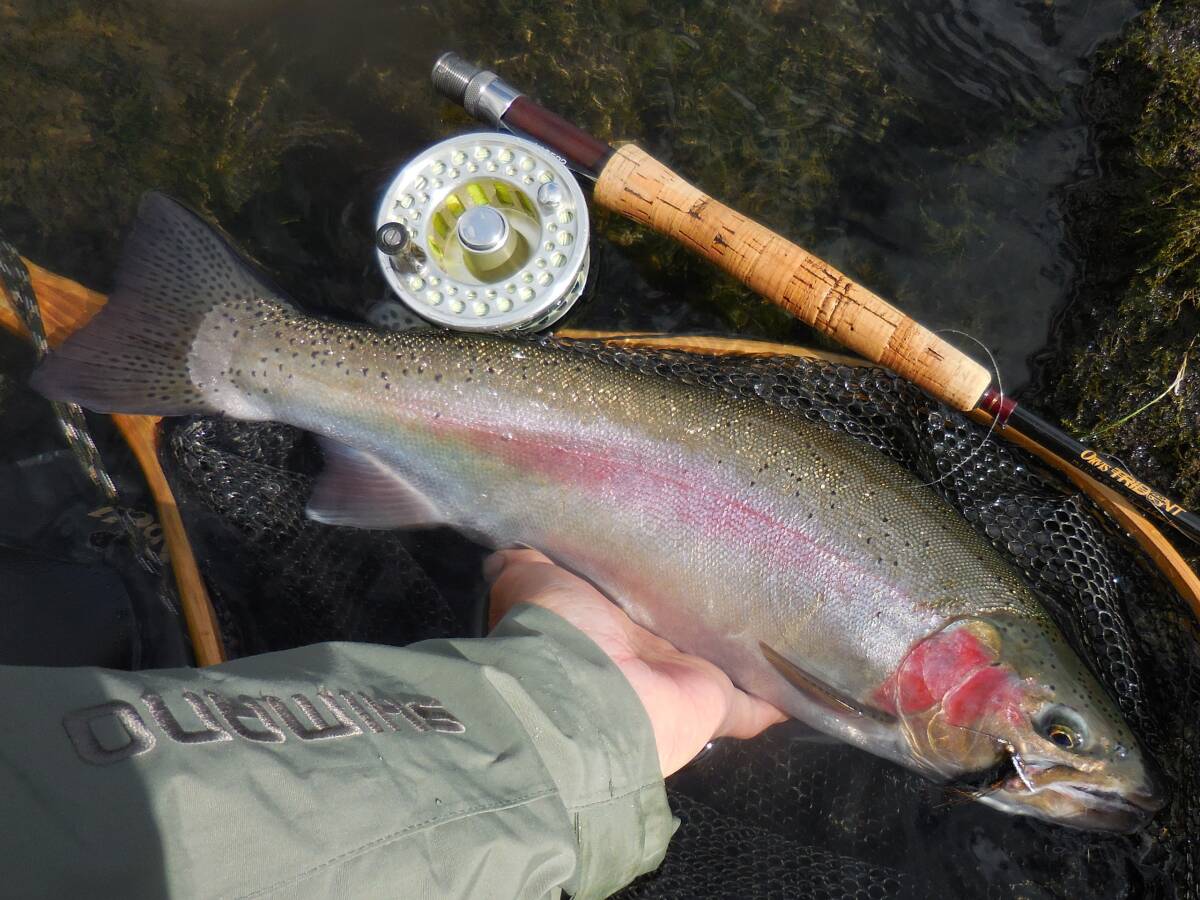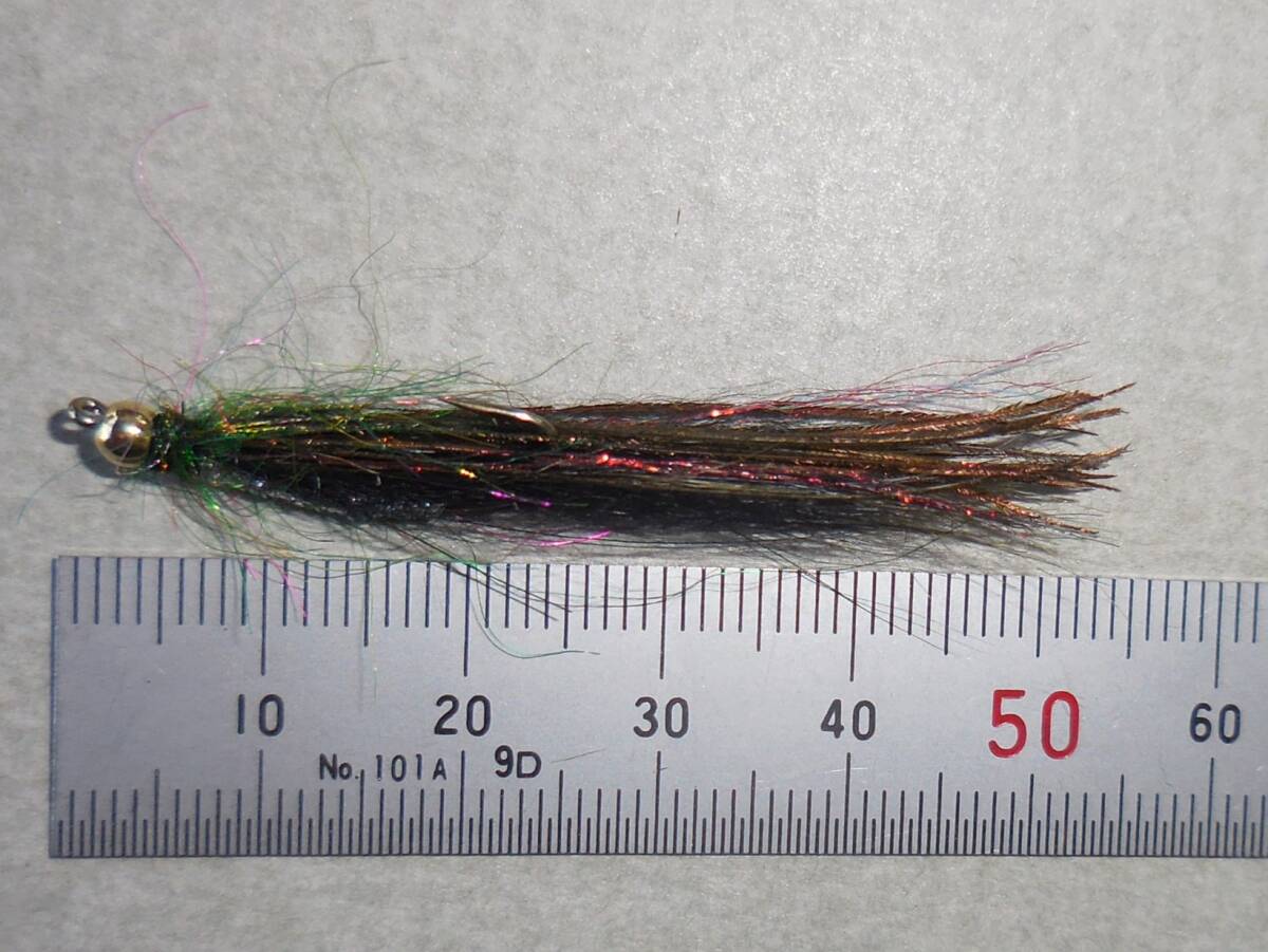 他のストリーマーでアタリがきますが喰わず、当フライに替えた2投目のリトリーブ、掛かったのは50cmのニジマスでした。その後、ポイントを移動して小型ニジマスが3匹掛かり、最後にスイング後に48cmのニジマスが。使用時間が短いながらもとても好調でした。