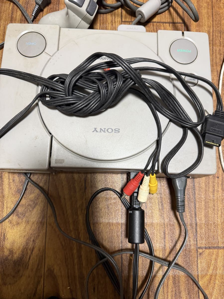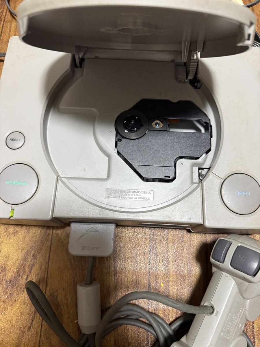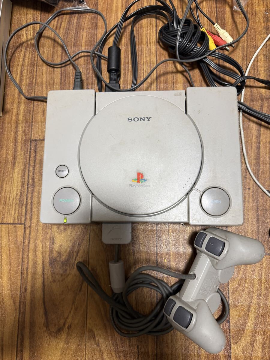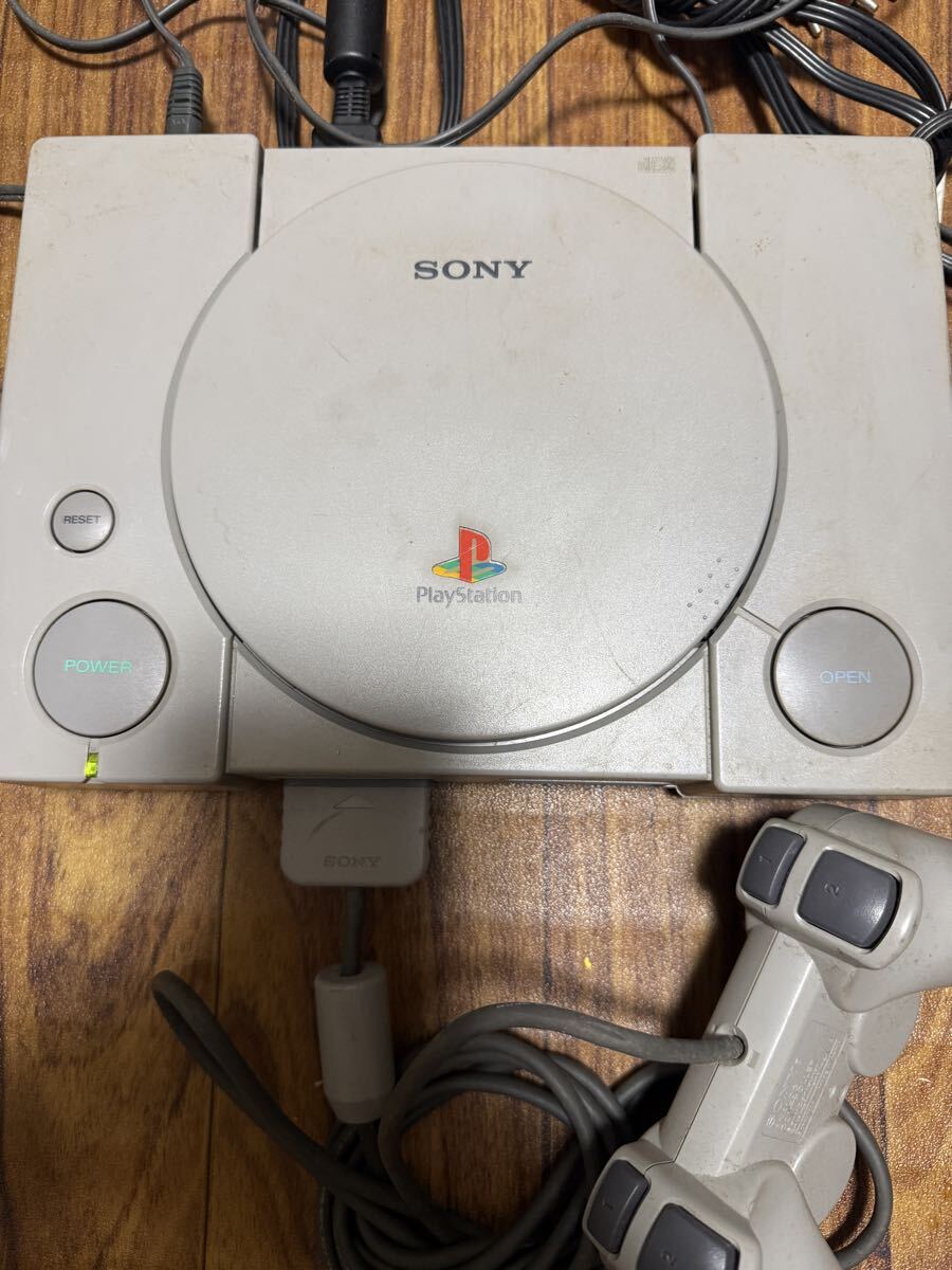 PlayStationには、小型化された「PS one」(型番:SCPH-100)や、復刻版の「プレイステーション クラシック」(型番:SCPH-1000RJ)といった後継モデルや派生モデルも存在します。写真の本体は、ディスクカバー中央の「SONY」ロゴと「PlayStation」
