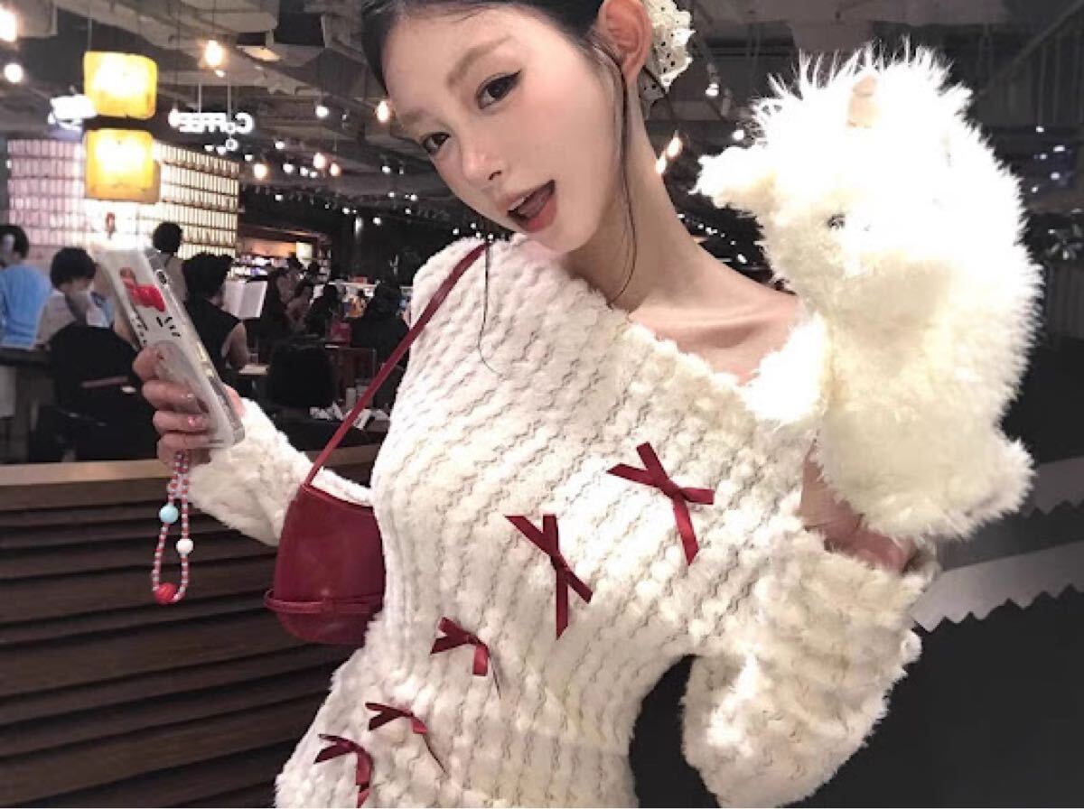 赤リボンのアクセントが可愛らしく、ボディラインを美しく見せてくれるシルエットが魅力。