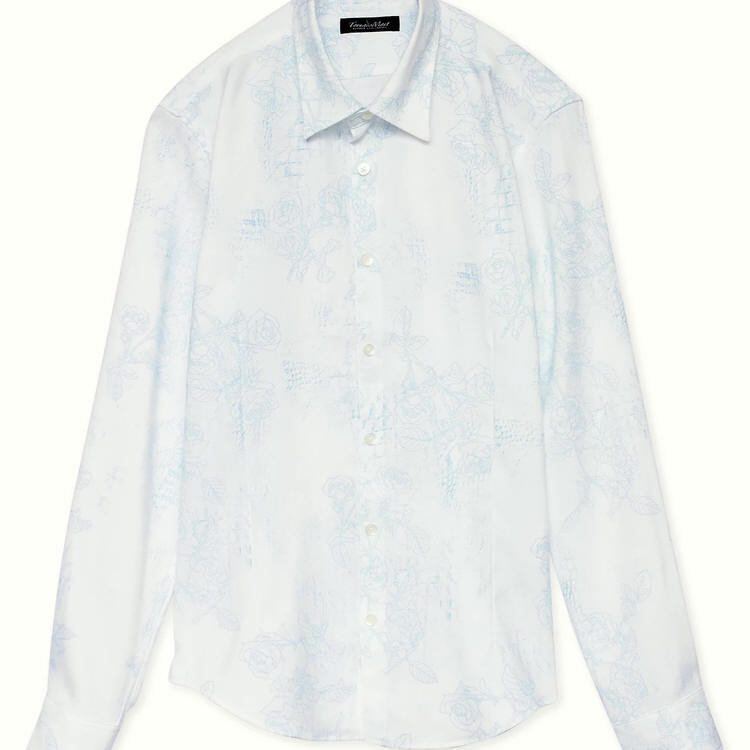 ■花と爬虫類の異種ミックスモチーフを、白ボディに細線でさらっと描くことで、白シャツライクに取り入れやすい柄シャツに仕上がっています。