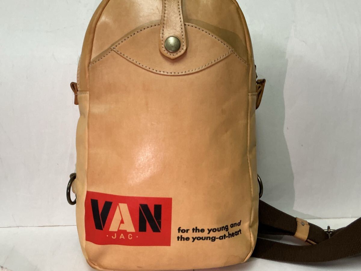 送料無料!VAN JACKET INC. ヴァンヂャケット VANオリジナルボディバッグの出品です。サイズは縦が最大約30cm 横が最大約20cm マチが約6cmです。素材は天然ヌメ革(牛革)になります。画像よりもう少し薄めです。細かいキズ ヨゴレはありますが使用頻度が少なめの美品です。画像にてご確認いただきNC NRでお願いいたします。送料無料で発送いたします。