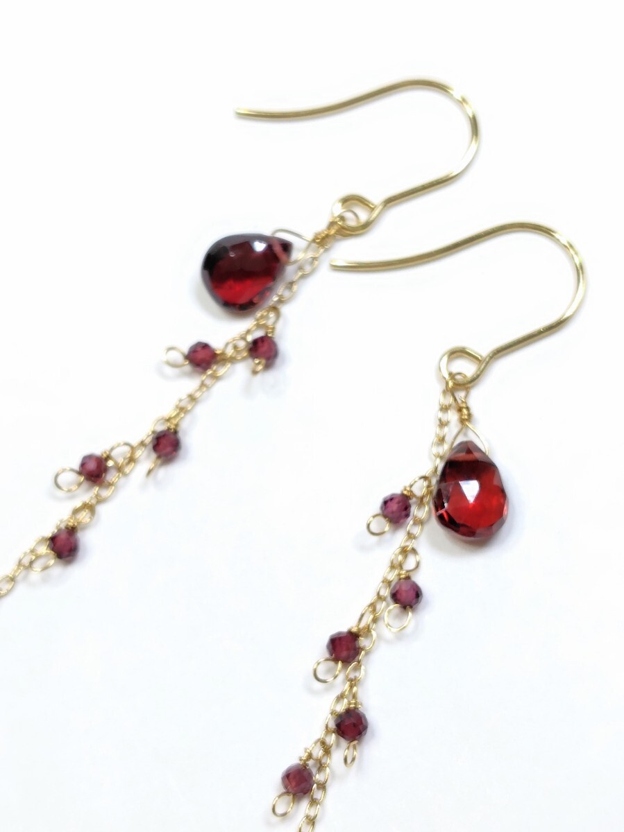ガーネット(ペアシェイプカット・ラウンドカット型)7×5・2mm、ピアスフックはサージカルステンレス、チェーンと金具はメッキ、ワイヤーは真鍮(ゴールドカラー)