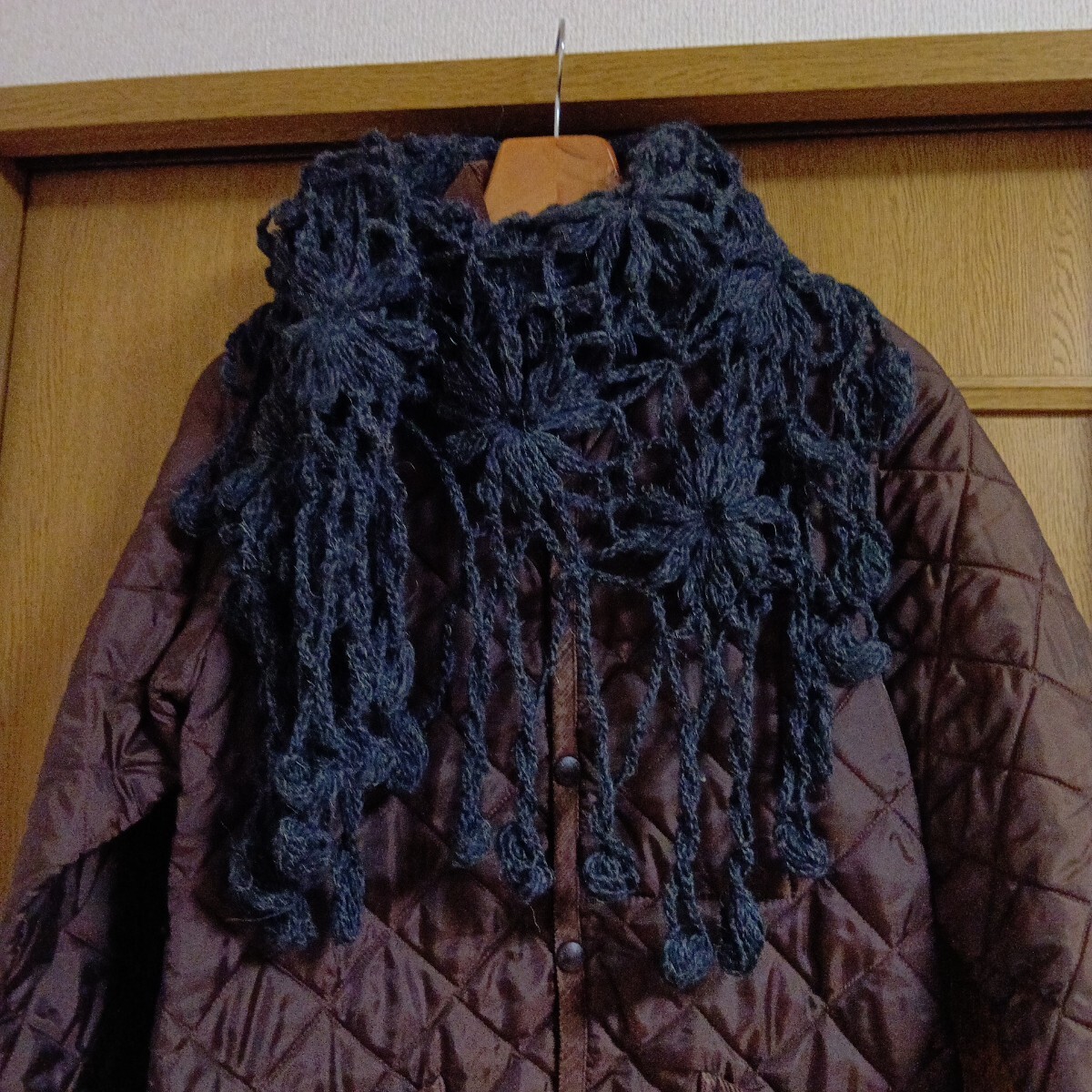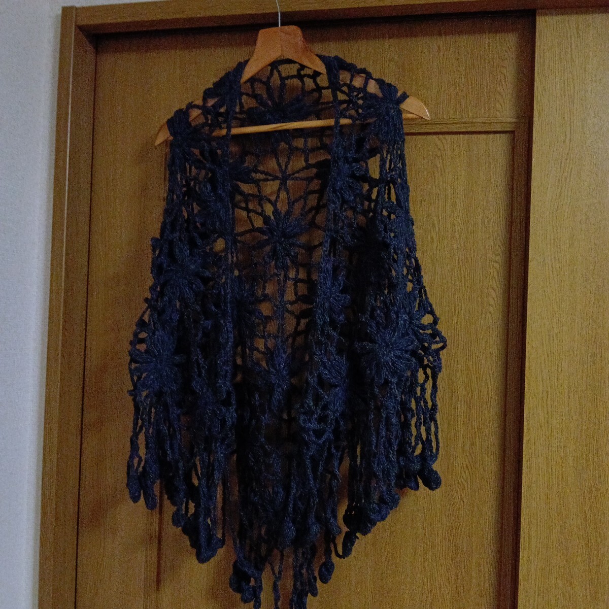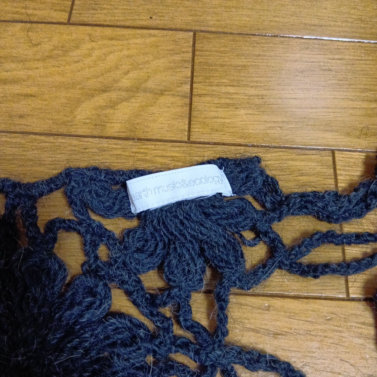 その他 :色はチャコール、ニットの三角形で粗めの透かし編み、周りがフリンジのようになっています。好きな形で使用出来ます。