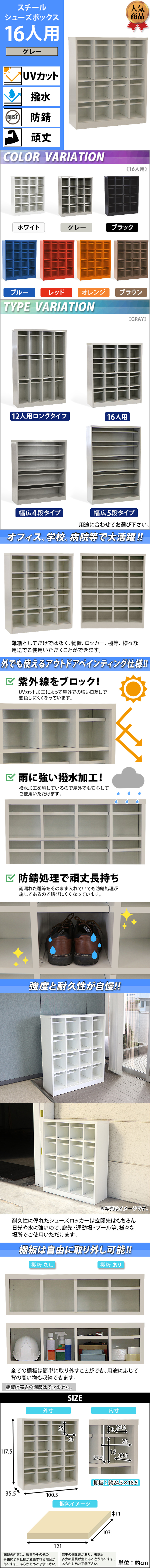 | 商品名 | 送料無料 ロッカー おしゃれ スチール シューズボックス 16人用 オープンタイプ 灰 棚板付き 扉なし 4列4段 UVカット 撥水 防錆 頑丈 シューズロッカー シューズラック スチールロッカー スリム 更衣ロッカー 靴箱 下駄箱 棚 物置 屋外 中棚 収納 プール グレー sy2016agr |