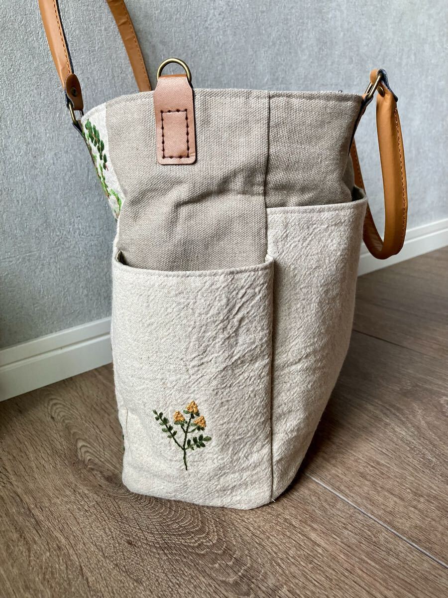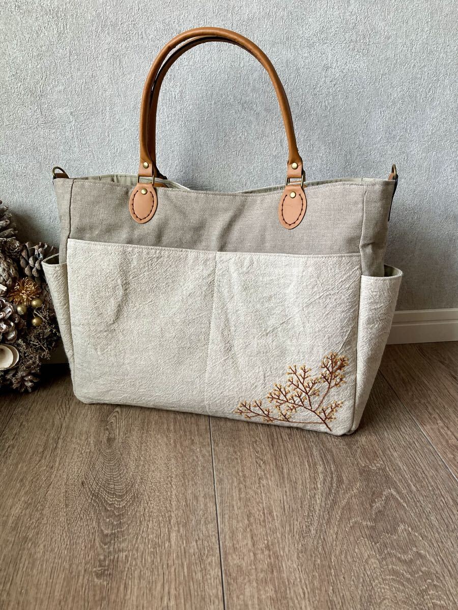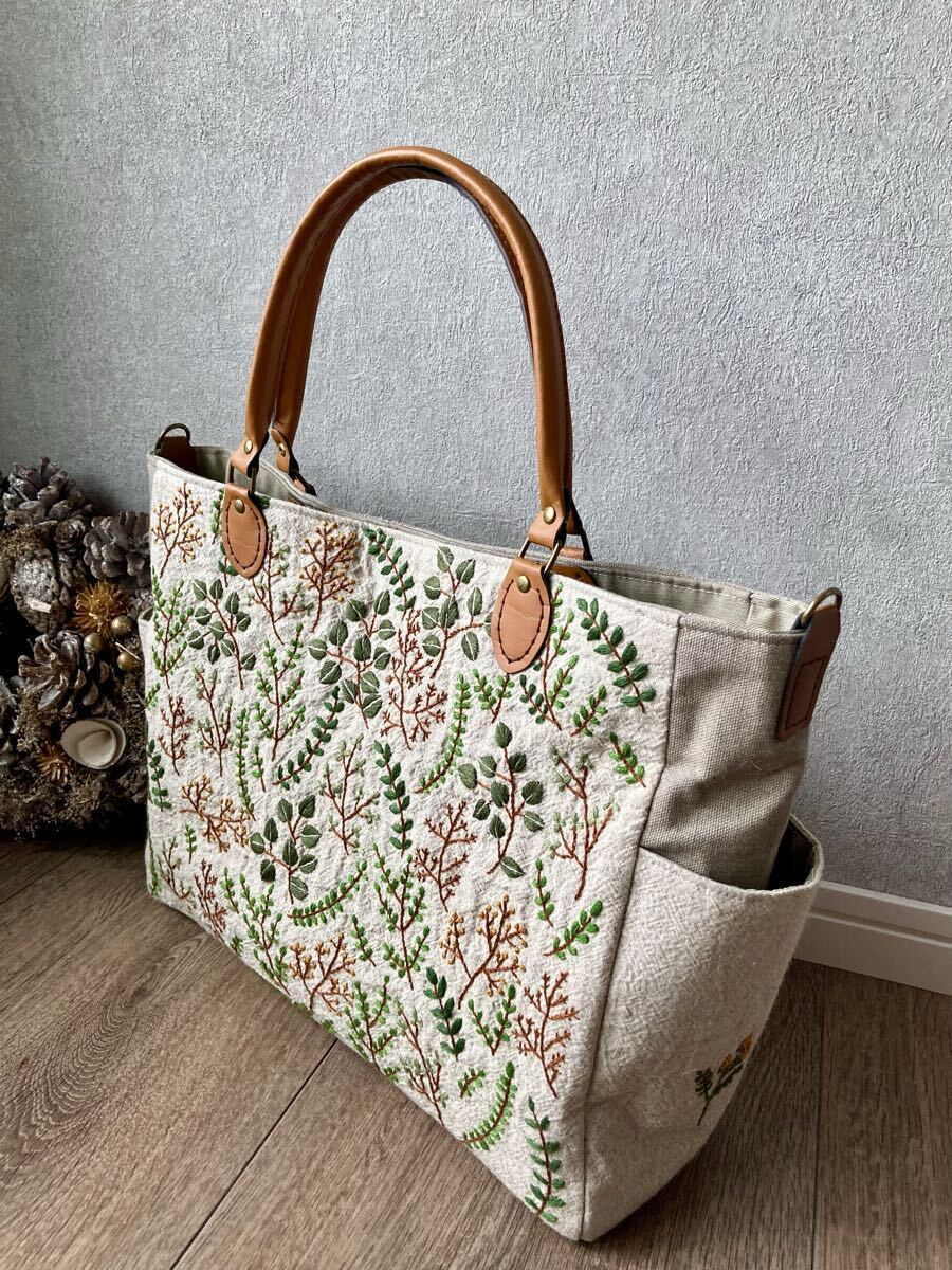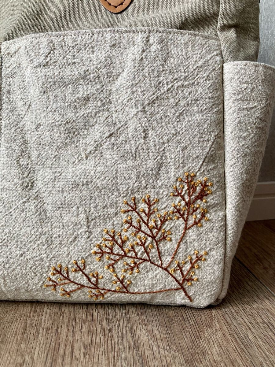両サイドと後ろ面のポケットはコットンリネンに刺繍をしています。