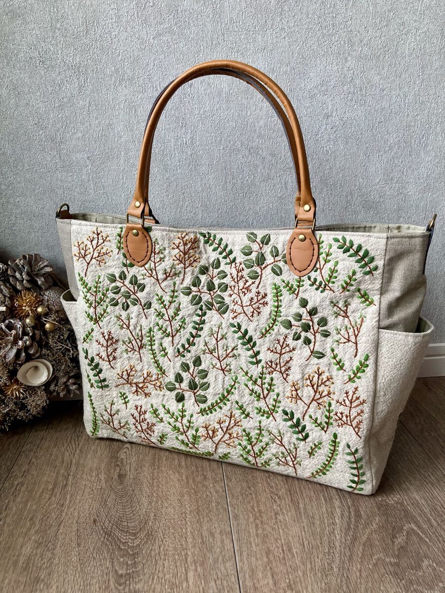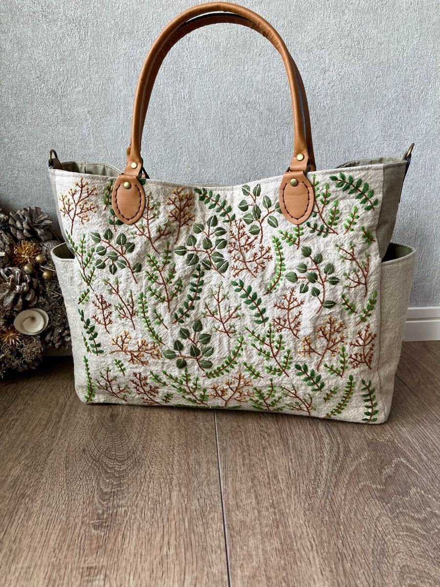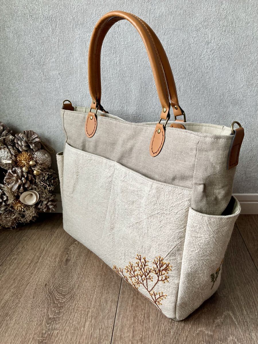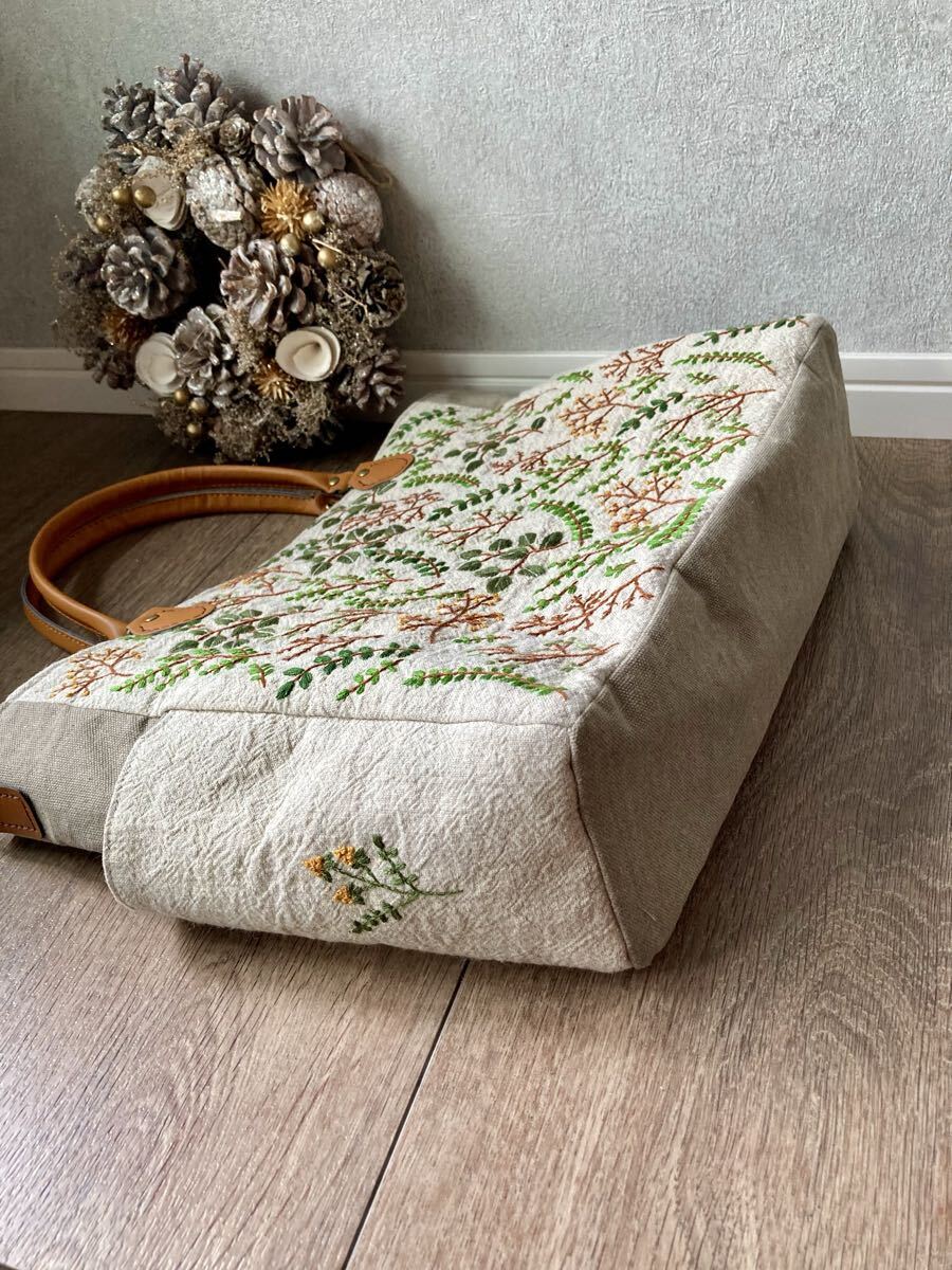 両サイドと後ろ面のポケットはコットンリネンに刺繍をしています。