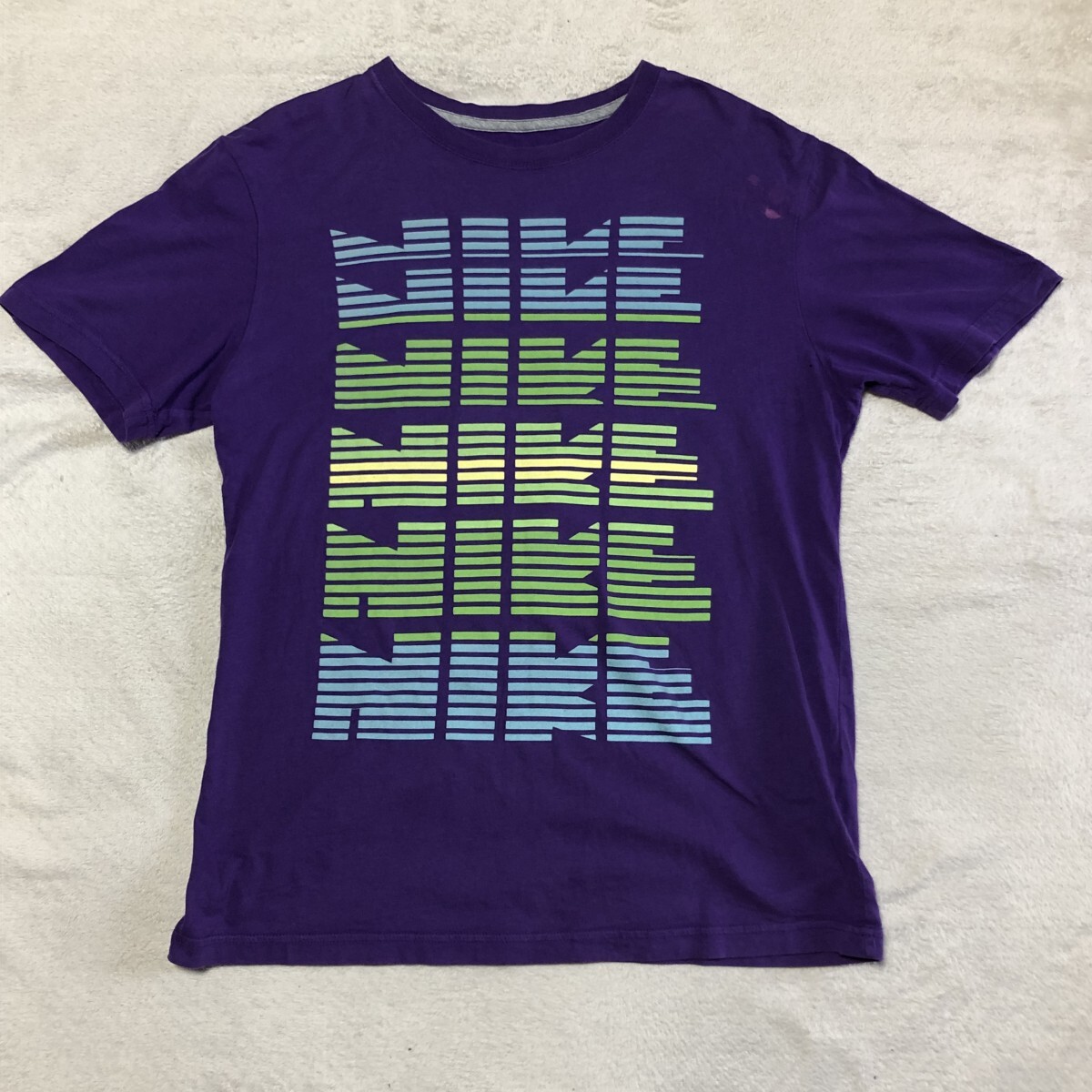 NIKE ゴツナイキ 5連ロゴプリント 半袖Tシャツ クールネック パープル スタンダードフィット 人気の大きいサイズ Lサイズ