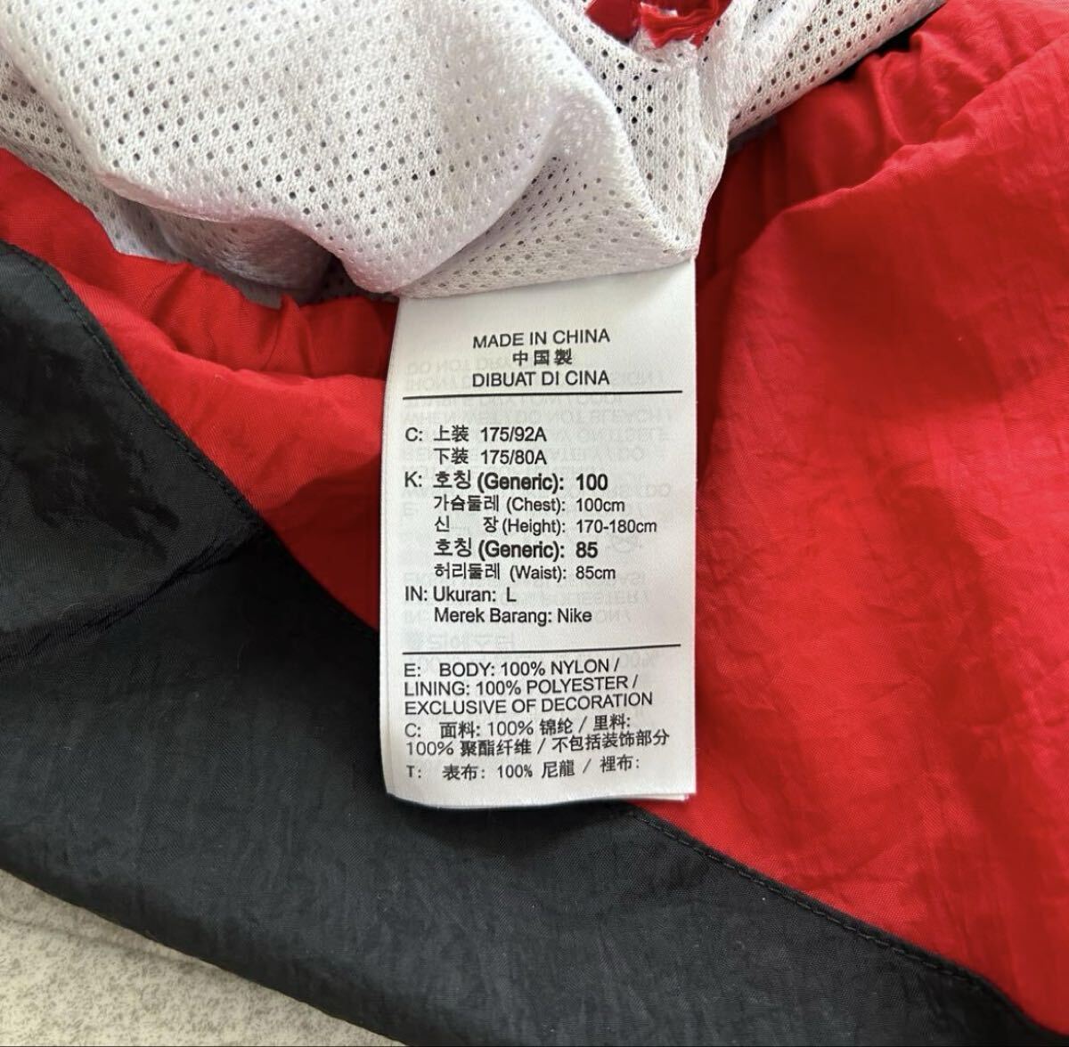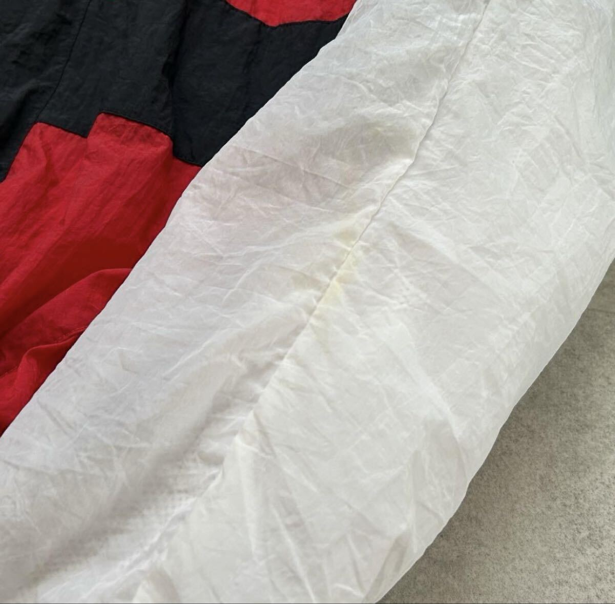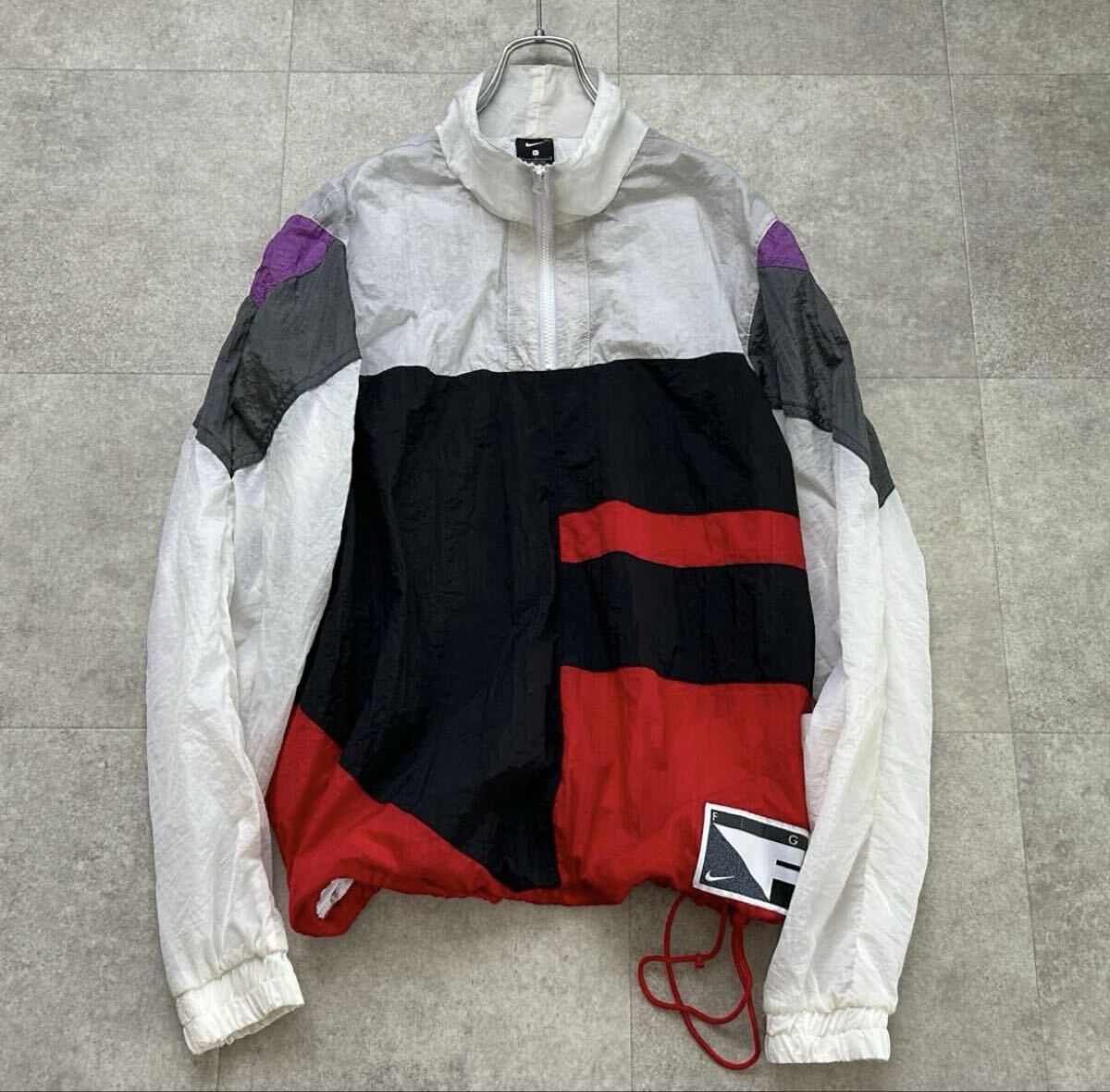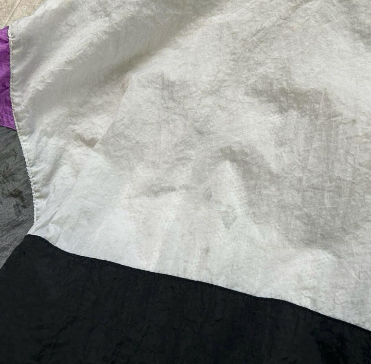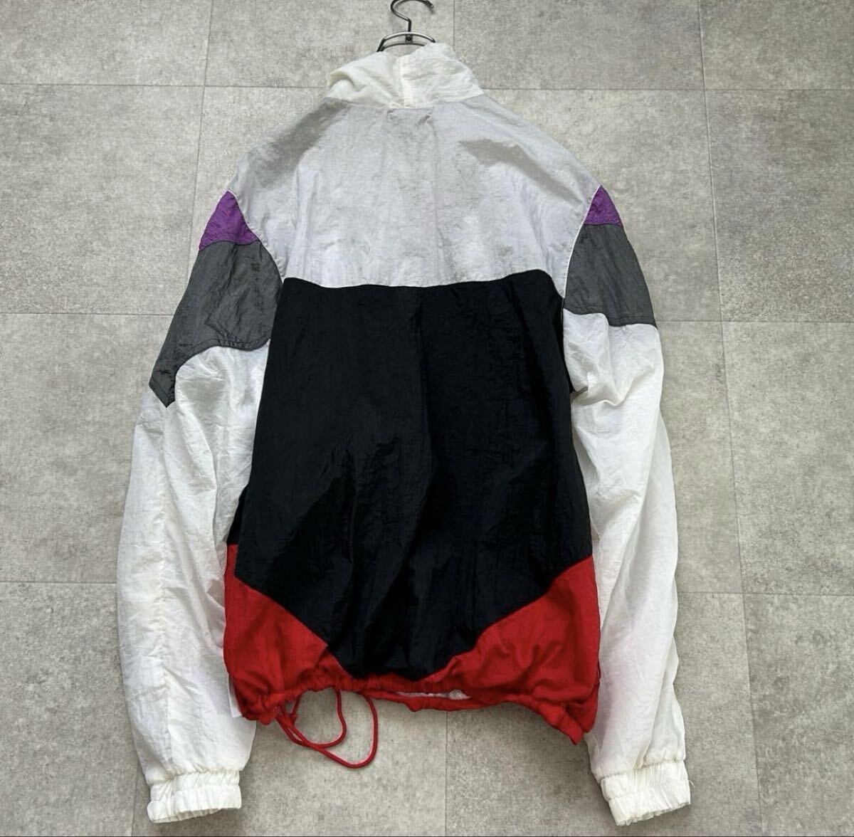 ブラック×レッド×ホワイト×パープルのテック系配色。裏地メッシュ仕様で軽量。袖や白地部分に軽い黄ばみあり。